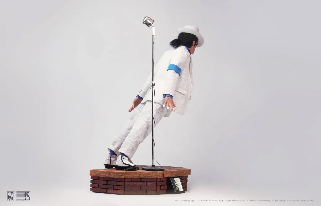 PureArts präsentiert Michael Jackson in seiner ikonischen Smooth Criminal Pose aus dem berühmten Musikvideo, das am 13. Oktober 1988 auf MTV uraufgeführt wurde und die zentrale Szene aus dem Film Moonwalker ist. Im Oktober 1993 schuf das MJ-Team das patentierte System von Spezialschuhen und Bodenpflöcken, um den berühmten Anti-Gravity Lean für Live-Konzerte nachzubilden.