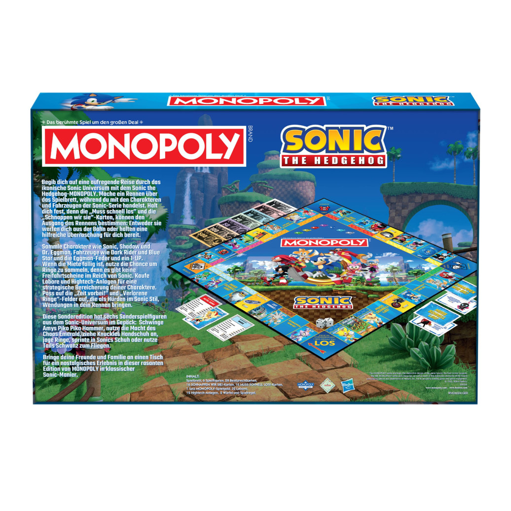 Der kultige Brettspielklassiker Monopoly trifft auf den beliebten blauen Igel. Farbenfrohes Spielbrett ganz im Stil von Sonic. Anstelle von Straßen gibt es hier die beliebten Charaktere aus der Welt von Sonic zu kaufen. Enthält 6 Sonderspielfiguren. Das perfekte Geschenk für alle Fans und Nostalgiker.