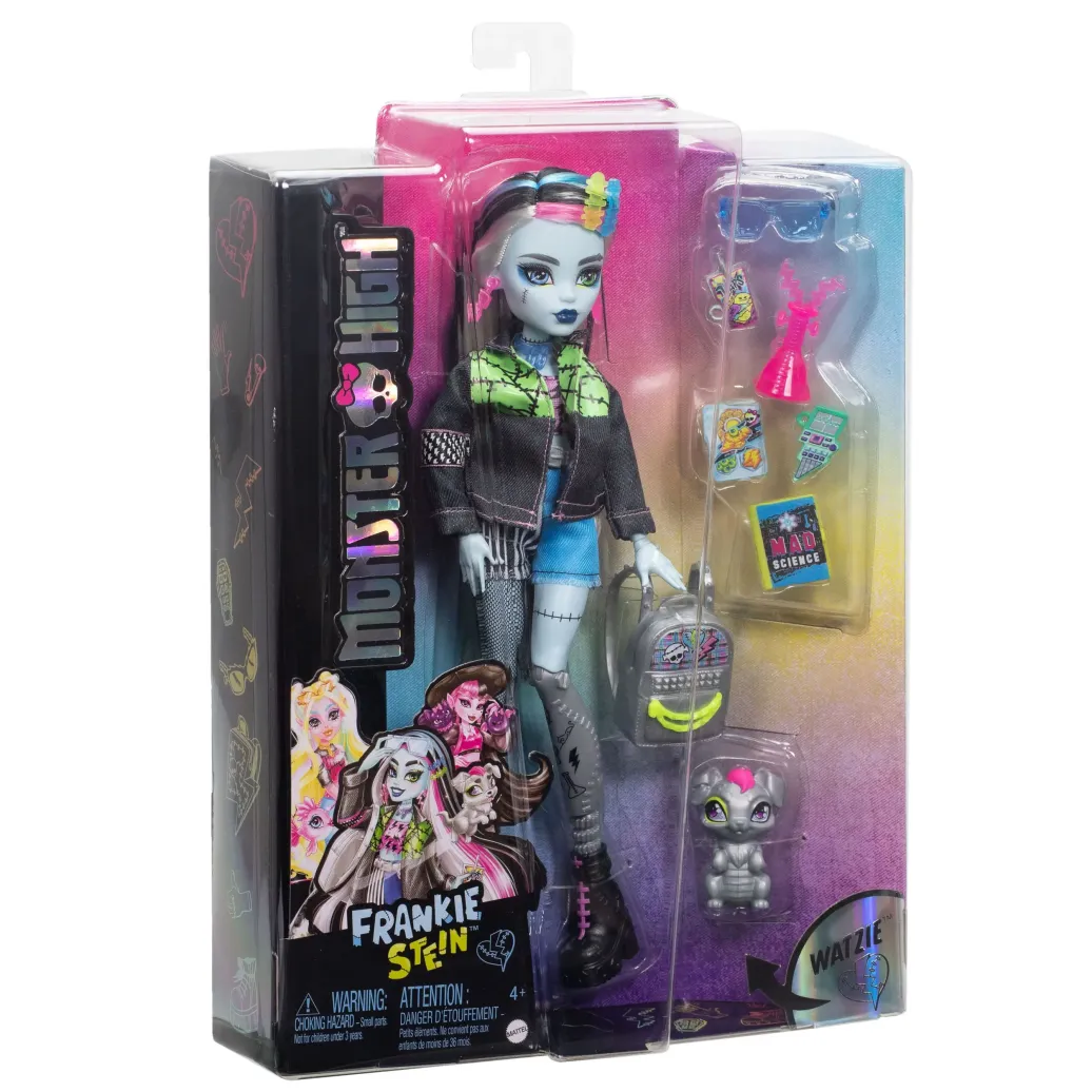 Die Monster High Frankie Stein-Puppe begeistert die Modewelt mit einem spuktastischen Look! Zum Lieferumfang gehören Frankies Hündchen Watzie sowie tolle Zubehörteile für spuktakulären Spielspaß.