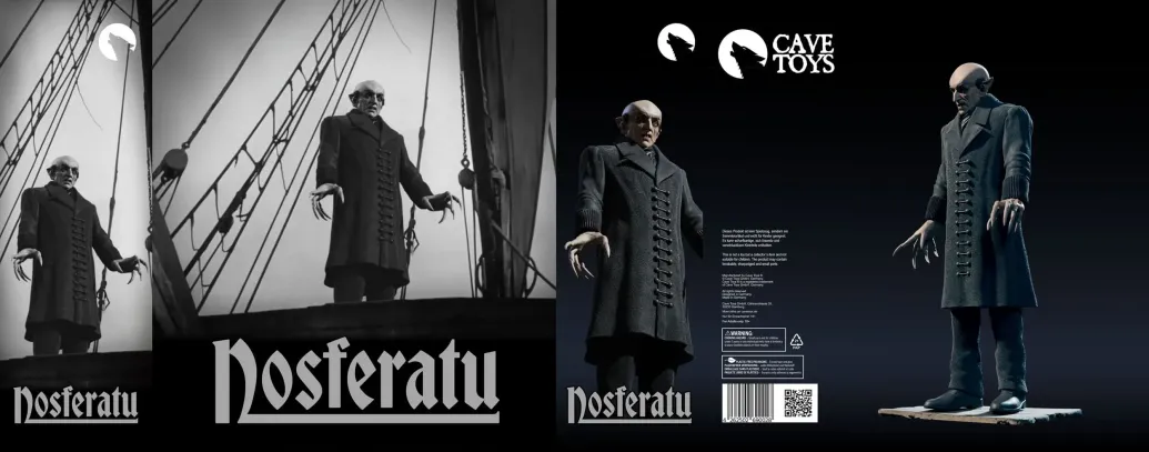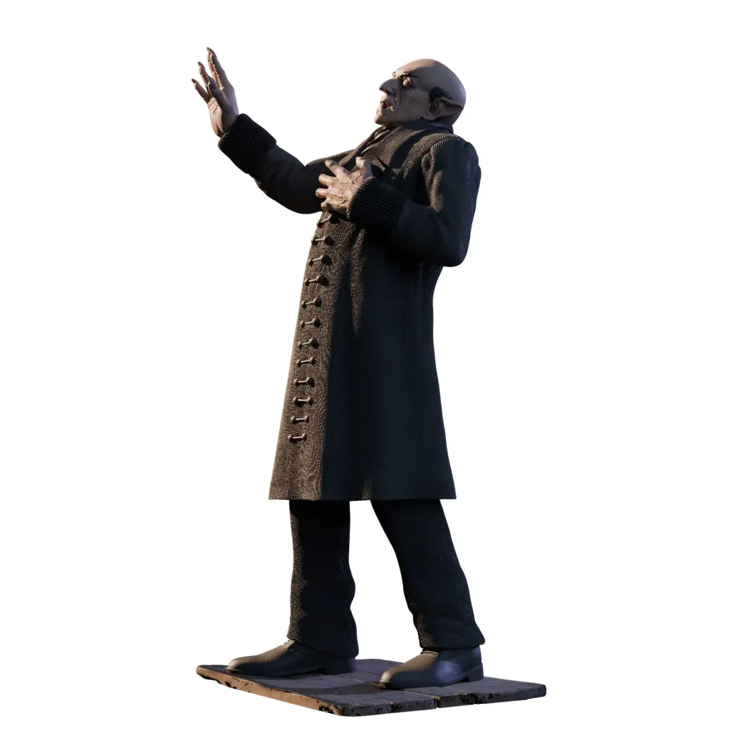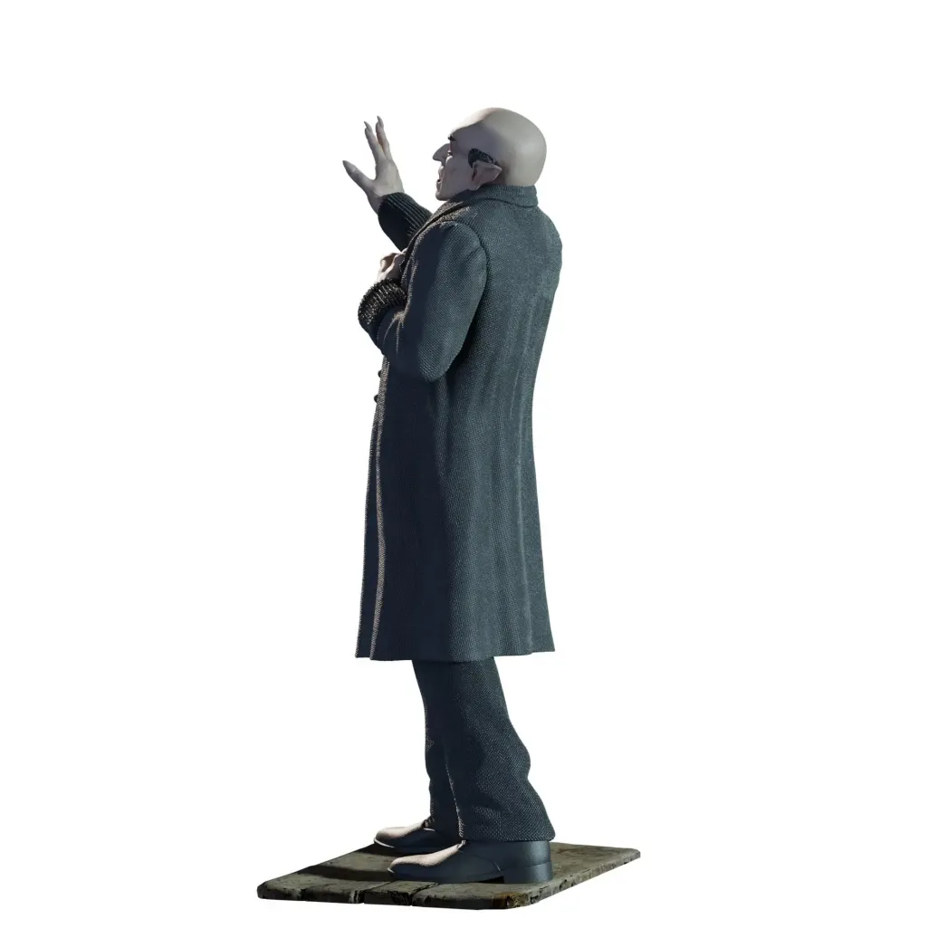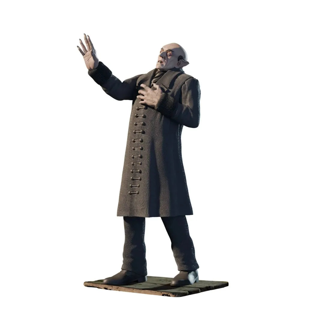 Graf Orlok wird in seiner klassischen Erscheinung dargestellt, mit einer blassen, fast geisterhaften Hautfarbe. Sein Gesicht, das von Schreck in einer der unheimlichsten Darstellungen des Vampir-Mythos verkörpert wurde, ist schmal und verzerrt, mit spitzen Zähnen, die seine dämonische Natur unterstreichen. Die Augen sind tief in den Höhlen und wirken fast leblos, was eine Atmosphäre von Unheimlichkeit erzeugt. Die langen Finger mit spitzen Nägeln, die er so charakteristisch in der Filmvorlage hält, sind ebenfalls detailreich und fügen sich perfekt in die Darstellung der Horrorfigur ein.