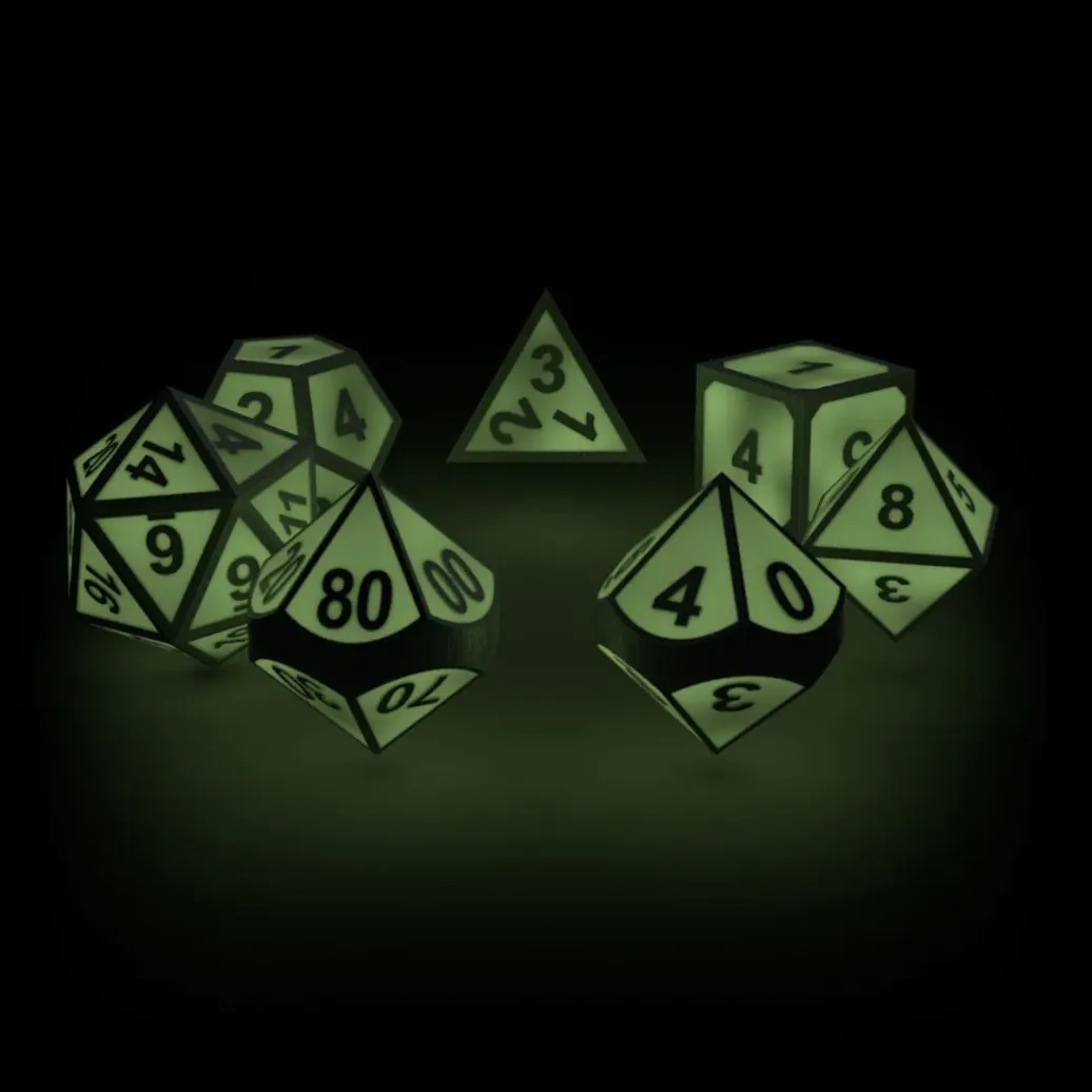 Diese Würfel bestehen aus Metall. Das merkt man auch am Gewicht, wodurch sie besonders gut in der Hand liegen. Der Clou sind die farbigen Flächen, welche im Dunkeln leuchten. Also: Licht aus, Würfel an!