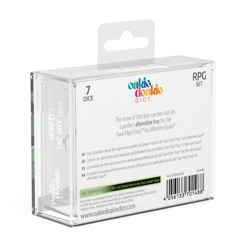Die Role-playing Game Sets bestehen aus 7 Würfeln: W6, W4, 2x W10 (1er und 10er Schritte), W8, W20 und W12. Sie werden in einer super praktischen und stabilen Box mit einem ausziehbaren Fach geliefert, sodass du sie immer einfach und schnell einpacken und mitnehmen kannst.