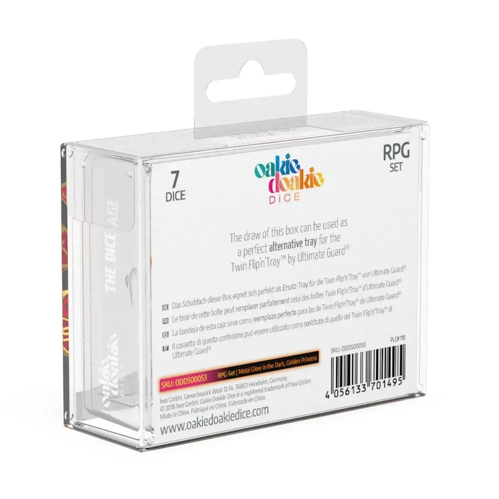 Die Role-playing Game Sets bestehen aus 7 Würfeln: W6, W4, 2x W10 (1er und 10er Schritte), W8, W20 und W12. Sie werden in einer super praktischen und stabilen Box mit einem ausziehbaren Fach geliefert, sodass du sie immer einfach und schnell einpacken und mitnehmen kannst.