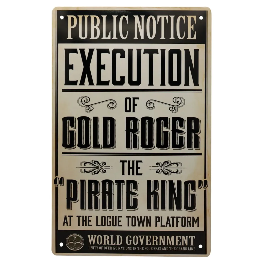 Dieses Set mit drei prominenten Schildern aus der erfolgreichen Netflix-Live-Action-Serie One Piece ist aus Zinn mit farbiger Vorderseite und Ecklöchern zur stolzen Präsentation gefertigt. Enthalten sind die Hinrichtungsanzeige für den Piratenkönig Gold Roger, ein Schild für das Schiff/Restaurant die Baratie und ein Schild für Party's Bar in Luffys Heimatstadt Foosha Village.