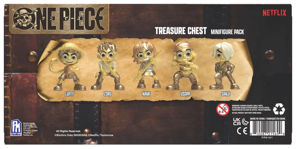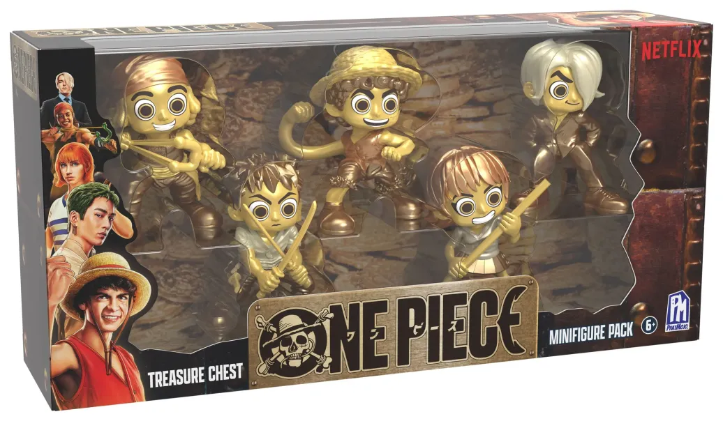 Schließe Dich den Strohhutpiraten an und suche nach dem One Piece mit dem Minifiguren-Paket "One Piece Series 1 Treasure Chest" aus der erfolgreichen Netflix-Serie! Dieses Minifiguren-Paket enthält Deine Lieblingspiraten Monkey D. Ruffy, Nami, Lysop, Sanji und Roronoa Zoro. Jede Minifigur ist ca. 6,5cm groß und verfügt über ein exklusives Goldfinish. Mit dem Minifiguren-Paket "One Piece Treasure Chest" fühlst du dich wie der König der Piraten!