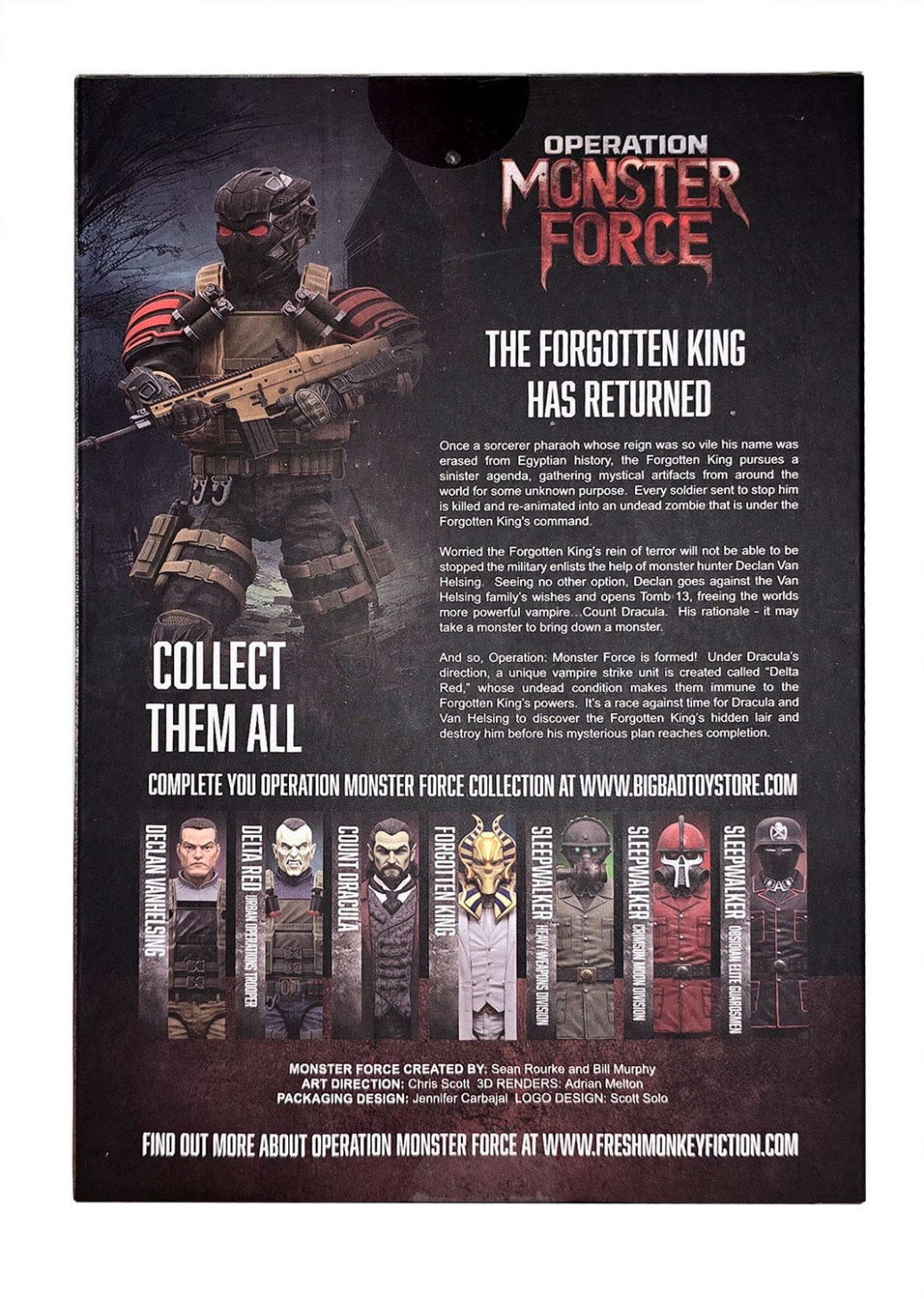 Aus der Reihe "Operation: Monster Force" kommt diese detailreiche Actionfigur im Maßstab 1/12. Sie ist ca. 15 cm groß und wird mit weiterem Zubehör und austauschbaren Teilen in einer bedruckten Box geliefert.
