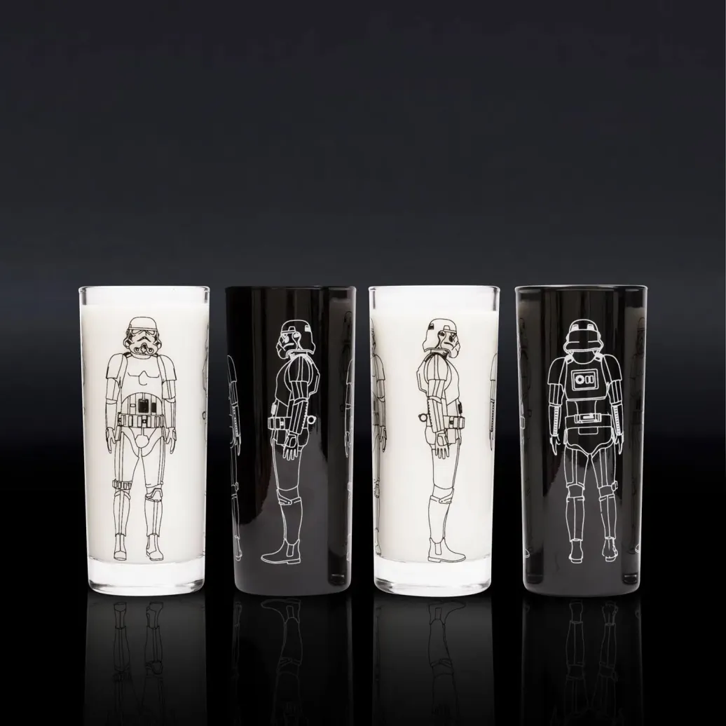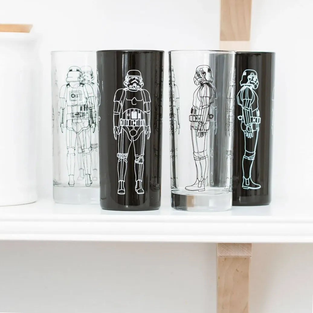 Schnapp dir deine Freunde und hebt die Gläser! Das galaktische Highball-Gläserset besteht aus zwei schwarzen und zwei klaren Gläsern, die mit Original Stormtroopern bedruckt sind. Ob Longdrink oder Limonade, mit diesem 4er-Gläserset bist du für deinen nächsten Filmeabend bestens ausgestattet.