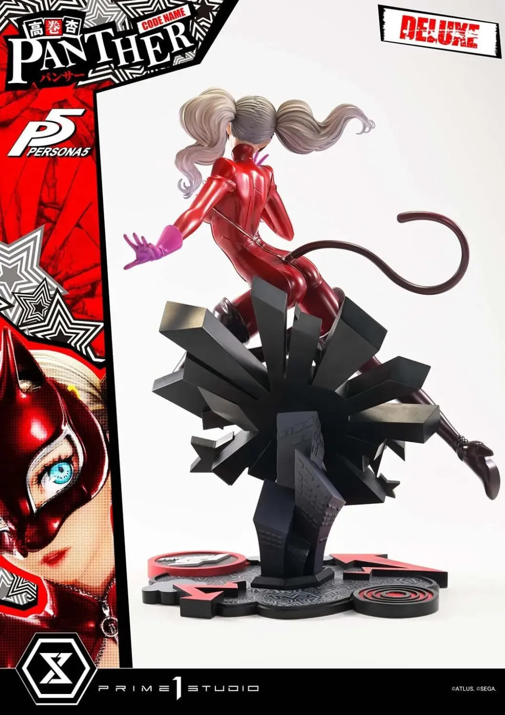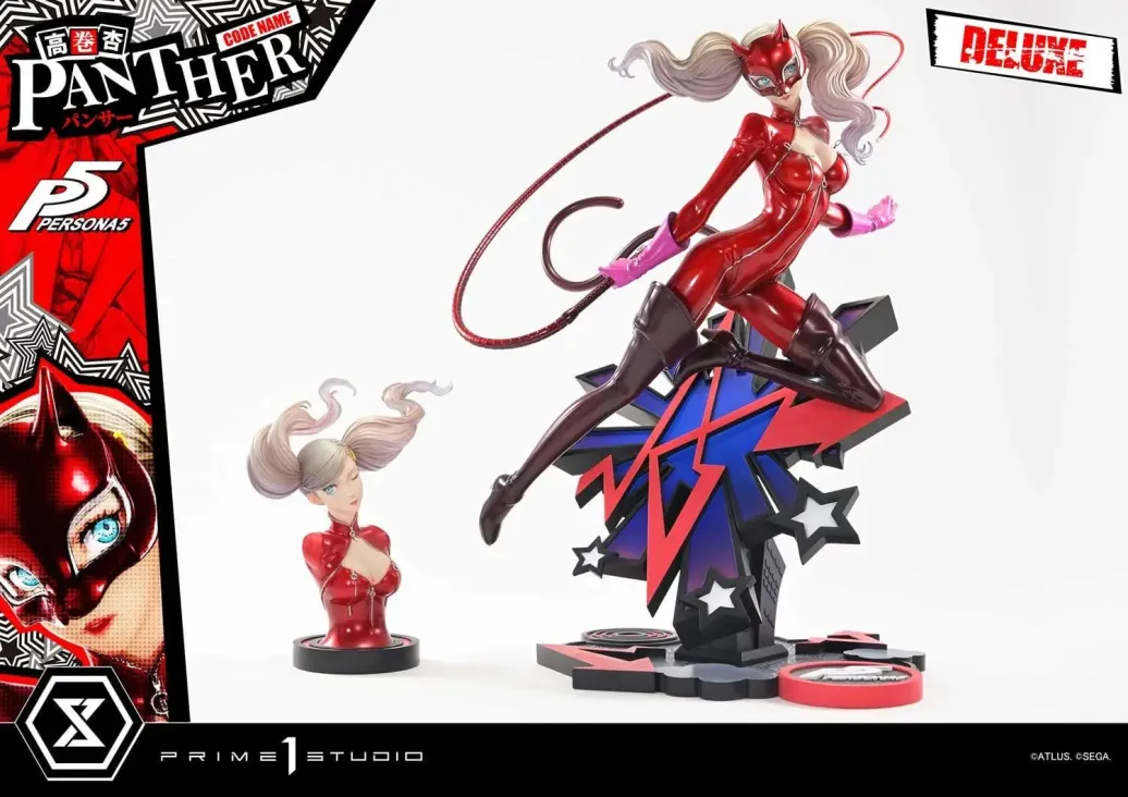 Die freigeistige „Panther“ erscheint nun in dynamischer 1/4-Größe! Aus dem erfolgreichen RPG „Persona 5“, einer Mischung aus „Schelmroman“ und „Schulalltags-Jugendserie“, stößt Ann Takamaki „Panther“ zur Premium Masterline-Reihe hinzu. Ann Takamaki, eine Viertel-Amerikanerin mit auffälligem Aussehen und einer Persönlichkeit, die Stärke und Freundlichkeit vereint, wird in ihrer Phantom-Diebin-Version im beeindruckenden Maßstab 1:4 dargestellt. Die dynamische Pose spiegelt ihren freigeistigen Charakter wider, während die Peitsche, die sich in einem anmutigen Bogen wölbt, die Komposition unterstreicht. Schattenreiche Zöpfe und ein Kostüm mit elegantem Glanz – jedes geformte und bemalte Detail wurde mit akribischer Sorgfalt gestaltet, um ihre geschmeidigen Proportionen zur Geltung zu bringen. Zu ihren Füßen befindet sich ein grafischer Sockel, der vom unverwechselbaren Designstil von „Persona 5“ inspiriert ist und in einem avantgardistischen Pop-Art-Look gestaltet wurde. Selbst die Stadtlandschaftselemente, die die Grafiken stützen, sind mit derselben raffinierten Sensibilität gestaltet und sorgen für eine rundum ausgefeilte Präsentation. Zusätzliche Teile sind enthalten, um den Ausdruck der Figur weiter zu variieren. Erlebe Ann so, wie sie ist, mit ihrem unverschleierten Gesicht. Schaffe einen entspannten Look mit dem Peace-Zeichen und der offenen Hand. Kombiniere diese Optionen und genieße eine große Auswahl an individuellen Präsentationsmöglichkeiten. Lebhaft und voller Charme wird Ann Takamaki „Panther“ mit exquisiter Modellierung und Farbgebung geliefert. Wie ihre zuvor erschienenen Phantom-Diebe-Kollegen, darunter der Protagonist „Joker“ und Makoto Niijima „Queen“, präsentiert sie sich in fein gearbeiteter Form.