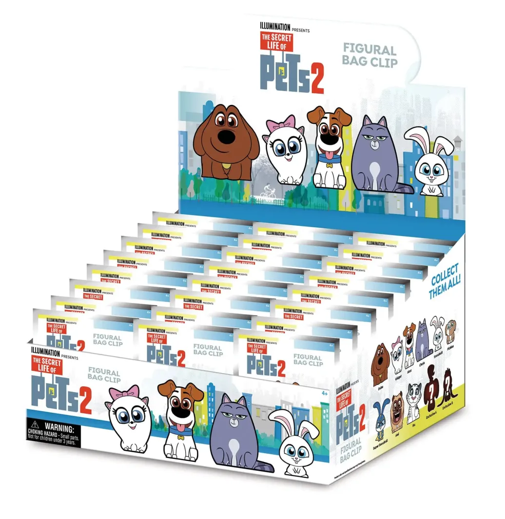 Display mit 24 Blind Bags mit je einem offiziell lizenzierten Taschenanhänger aus PVC.