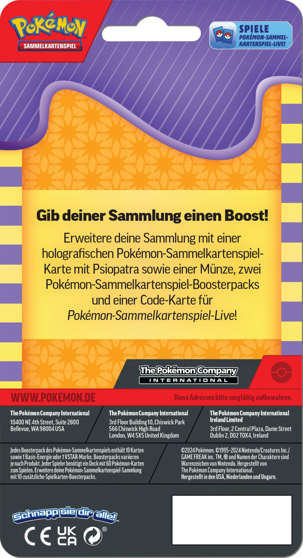 Psiopatra sowie einer Münze, zwei Pokémon-Sammelkartenspiel-Boosterpacks und einer