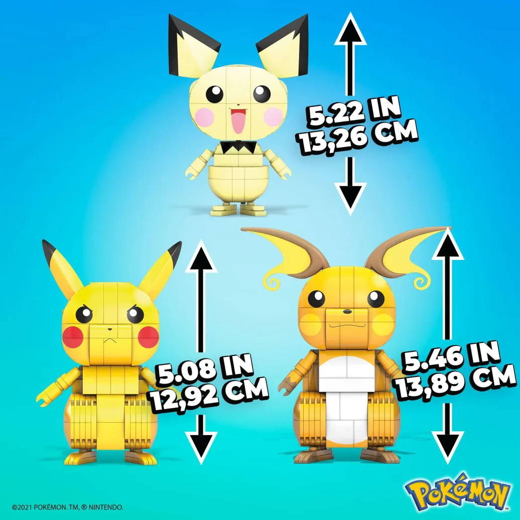 Dieses elektrische Trio ist bereit für den Kampf. Das Bauset enthält alle Pichu-Entwicklungen, einschließlich Pikachu und Raichu, die mit beweglichen Gelenken und besonderen Fähigkeiten ausgestattet sind. Spezielle Teile in Pichus Händen repräsentieren Elektro-Kräfte und auch Pikachu und Raichu haben besondere Fähigkeiten. Zusammen sorgen sie für ein tolles Bauerlebenis.