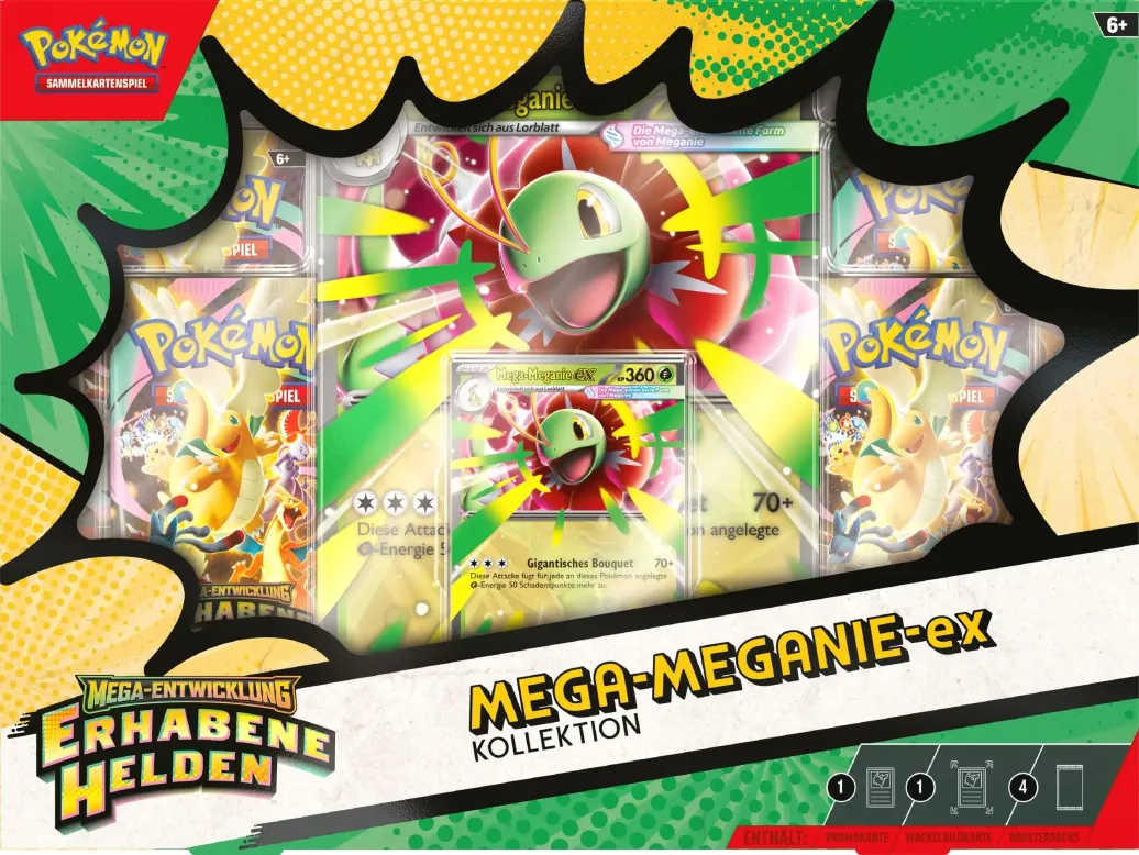 Mega-Meganie-ex erblüht in voller Macht und schenkt dem Pokémon deines Gegners ein Gigantisches Bouquet, das es in sich hat! In dieser Kollektion erwartet dich Mega-Meganie-ex als spielbare holografische Promokarte. Erhalte außerdem eine überdimensionale Wackelbildkarte mit dynamischer Illustration und vier Boosterpacks aus der besonderen Erweiterung Mega-Entwicklung - Erhabene Helden.