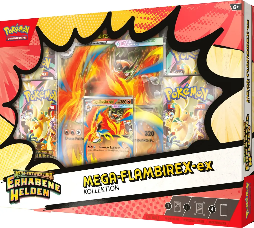 Mega-Flambirex-ex löst in Flammen gehüllt eine Feuerrote Explosion aus, um deinen Gegner zu vernichten! In dieser Kollektion erwartet dich Mega-Flambirex-ex als spielbare holografische Promokarte. Erhalte außerdem eine überdimensionale Wackelbildkarte mit dynamischer Illustration und vier Boosterpacks aus der besonderen Erweiterung Mega-Entwicklung - Erhabene Helden.