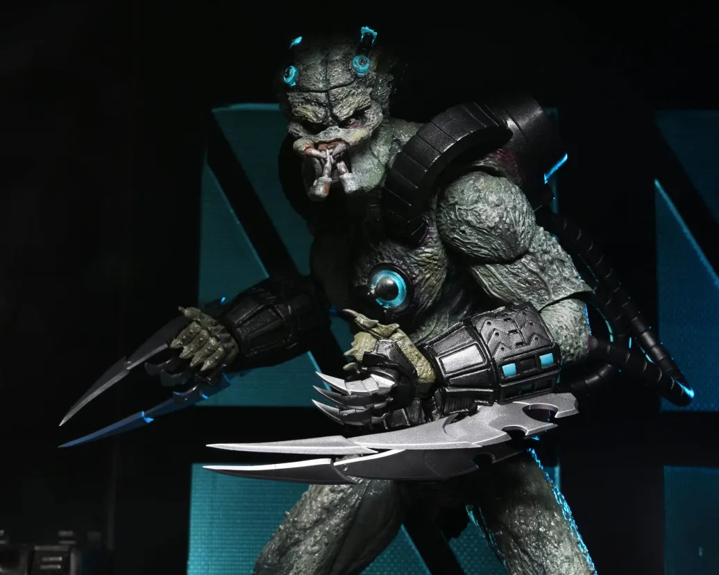 Zum Videospiel "Predator: Concrete Jungle" kommt diese mächtige Actionfigur aus NECAs Ultimate-Reihe. Sie ist ca. 25 cm groß, verfügt über LED-Leuchtfunktionen und kommt mit weiterem Zubehör in einer Fensterbox mit Klappdeckel.