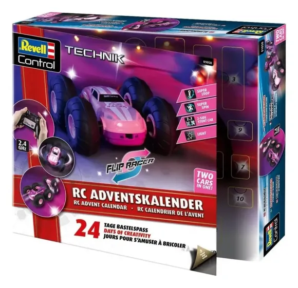 Adventskalender von Revell: 24 Tage Spielspaß mit dem 2-Kanal-Stuntcar FlipRacer Pink. Erleben Sie die Vorweihnachtszeit mit dem Revell Adventskalender 01058 FlipRacer Pink und dem aufregenden 2-Kanal-Stuntcar. In Pink und Violet lackiert, mit Allrad-Antrieb und LED-Beleuchtung, bietet dieses Stuntcar spektakuläre 180 Grad Flips und 360 Grad Spins. Jeden Tag entdecken Kinder ein neues Teil, bis am 24. Dezember das komplette Stuntcar zusammengebaut ist. 2-Side-Karosserie: beidseitig fahrbar für ungehinderten Spielspaß. Leuchtende Action: kraftvolle LED-Beleuchtung für beeindruckende Stunts. Präzise GHz-Fernsteuerung für volle Kontrolle. Perfekt für junge Technik-Fans.