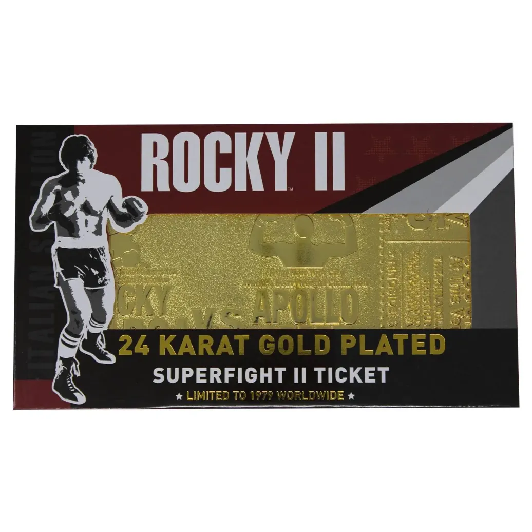 Offiziell lizenzierte Nachbildung einer Eintrittskarte aus Rocky II, beschichtet mit 24-karätigem Gold. Weltweit auf 1979 Stück limitiert.