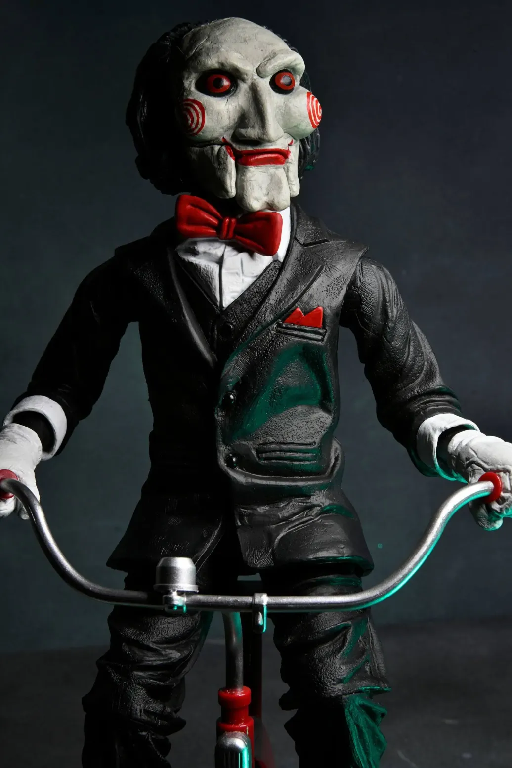 Zur Horrorfilm-Reihe Saw kommt diese detailreiche Actionfigur von Jigsaws Puppe Billy mitsamt Dreirad. Die Figur spricht verschiedene Sätze aus dem Film (in englischer Sprache).