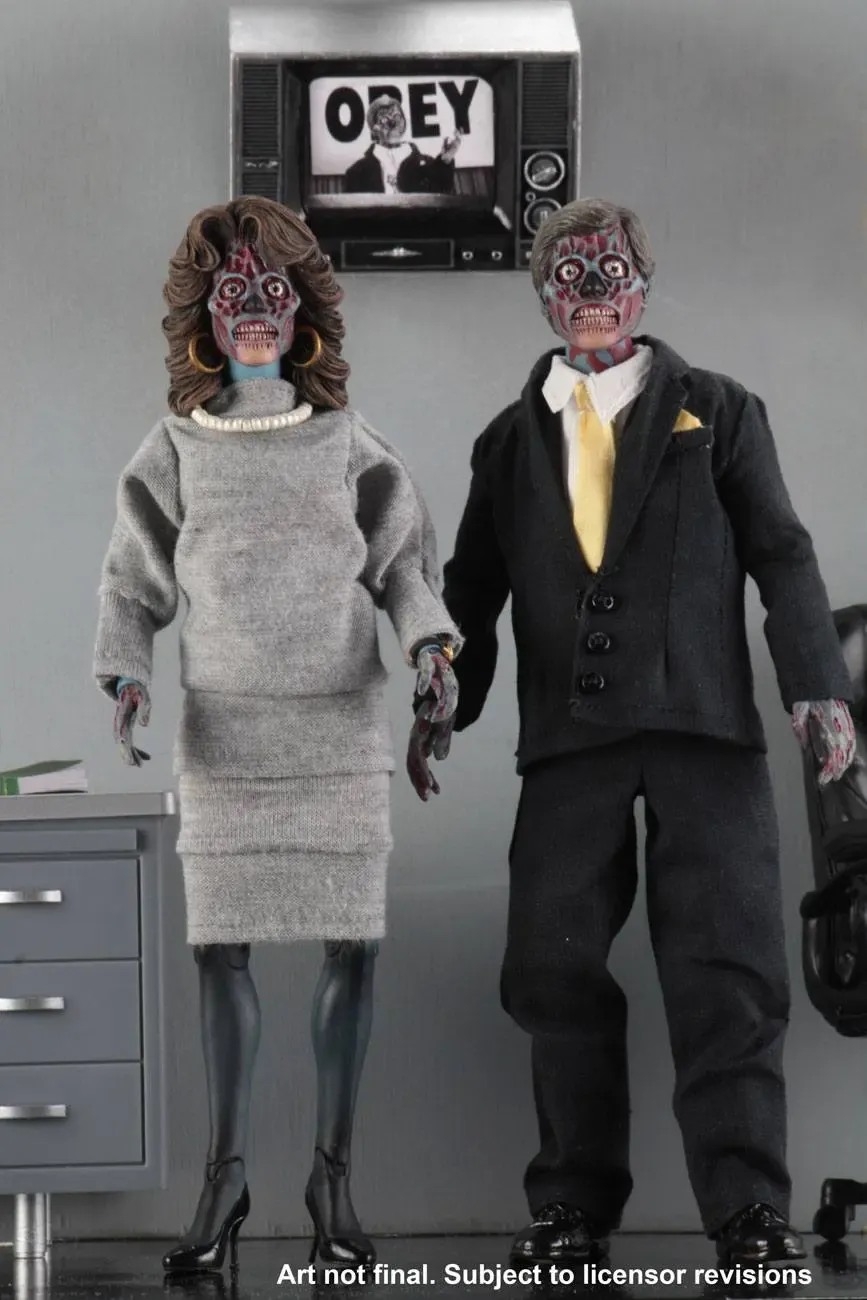 Zum Sci-Fi-Film Sie leben kommt dieser Pack mit 2 Aliens Actionfiguren im Retro-Look. Beide sind ca. 20 cm groß und tragen echte Stoffkleidung. Geliefert wird das Set mit weiterem Zubehör in einer Fensterbox.