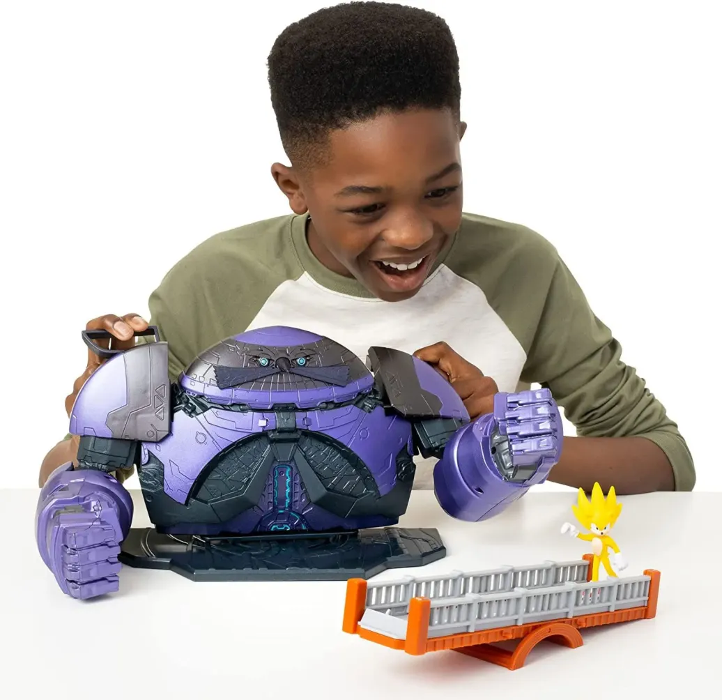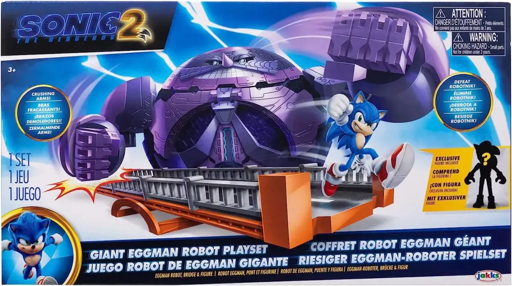 Kämpfe mit Sonic um Robotniks Giant Eggman Robot zu besiegen! Enthält eine exklusive 6 cm-Super-Sonic-Figur. Beweg die Arme von Robotnik zum Zerschmettern! Benutze die Brücke, um Super Sonic zu starten und den Giant Eggman Robot zu besiegen! Spielset enthält Giant Eggman Robot, Brücke und eine Sonic Figur.