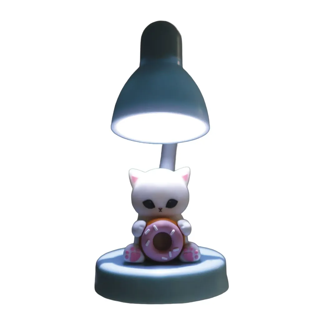 - Blaue Minilampe mit einer Minifigur Katze mit Donut