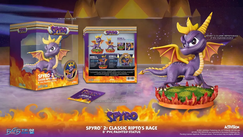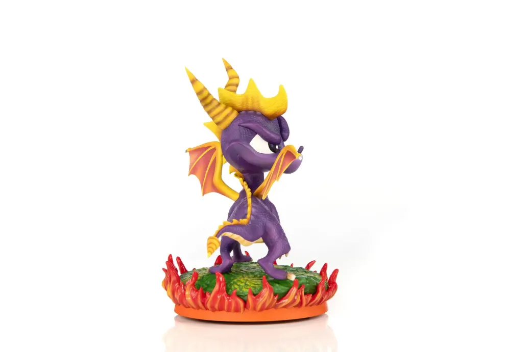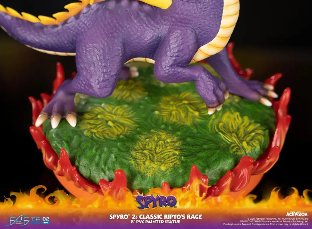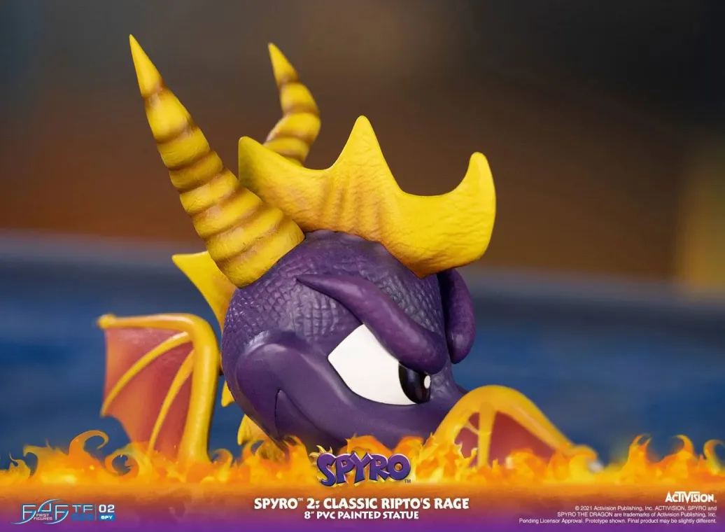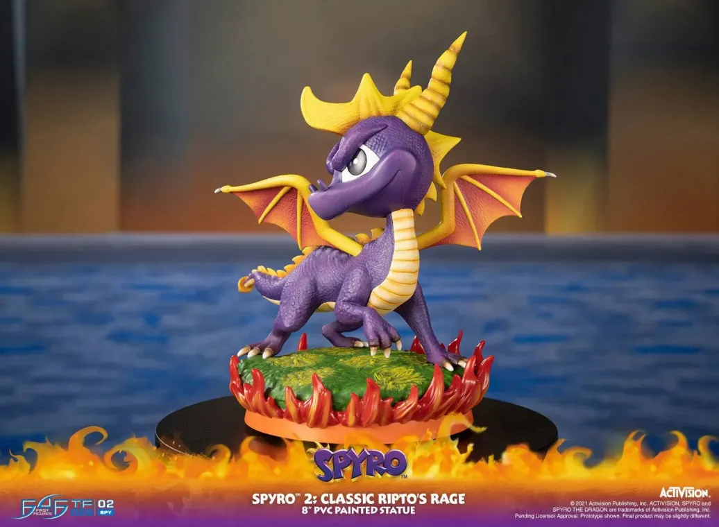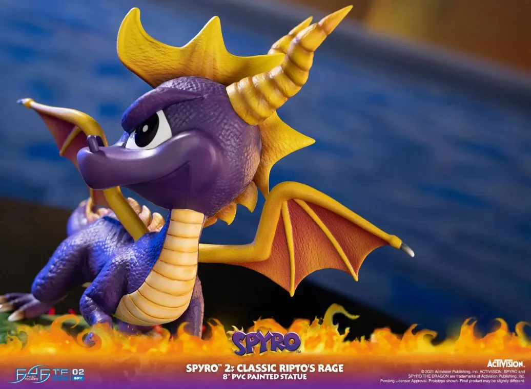 Zum Jump 'n' Run Videospiel Spyro 2: Ripto's Rage kommt diese coole PVC Staute. Spyro ist ein lila Drache, der viele Atemelemente wie Feuer, Erde, Elektro und Eis beherrscht. Zudem besitzt er die Fähigkeit die Zeit zu verlangsamen, welche nur lila Drachen haben, die alle 10 Generationen geboren werden.