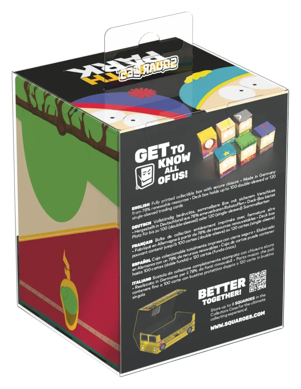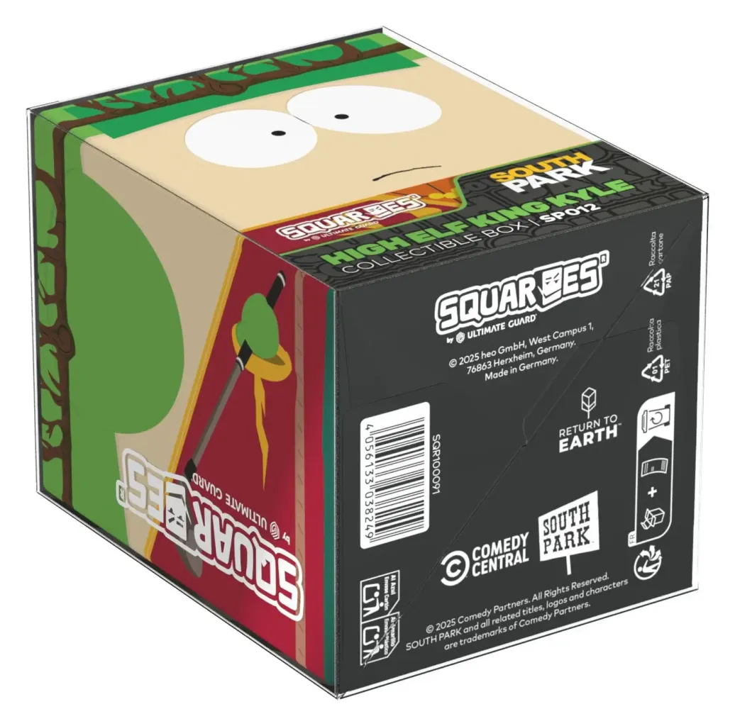 Sammelbare Box zur Aufbewahrung von TCG-Decks, Tabletop-Zubehör und/oder Sammlerstücken. Jeder Squaroe aus der South Park™-Edition bietet als Deck-Box benutzt Platz für bis zu 100 Spielkarten in doppelter Schutzhülle. Squaroes werden aus 78% erneuerbaren Rohstoffen hergestellt und passen perfekt in das separat erhältliche Collectors Case.