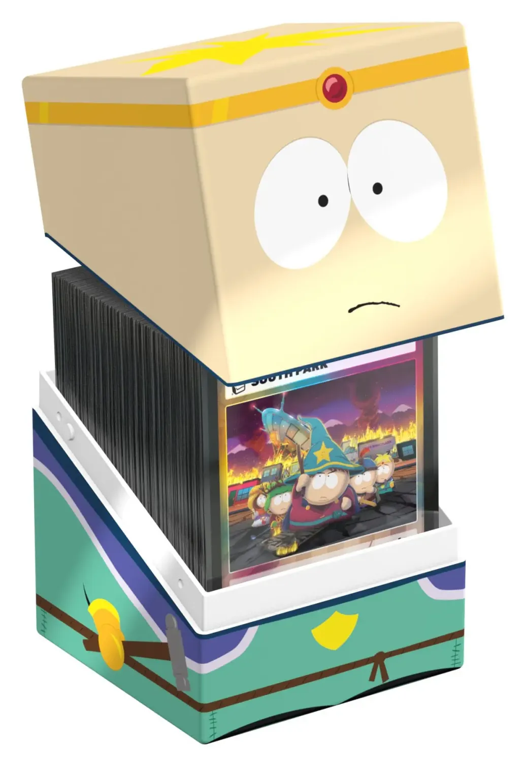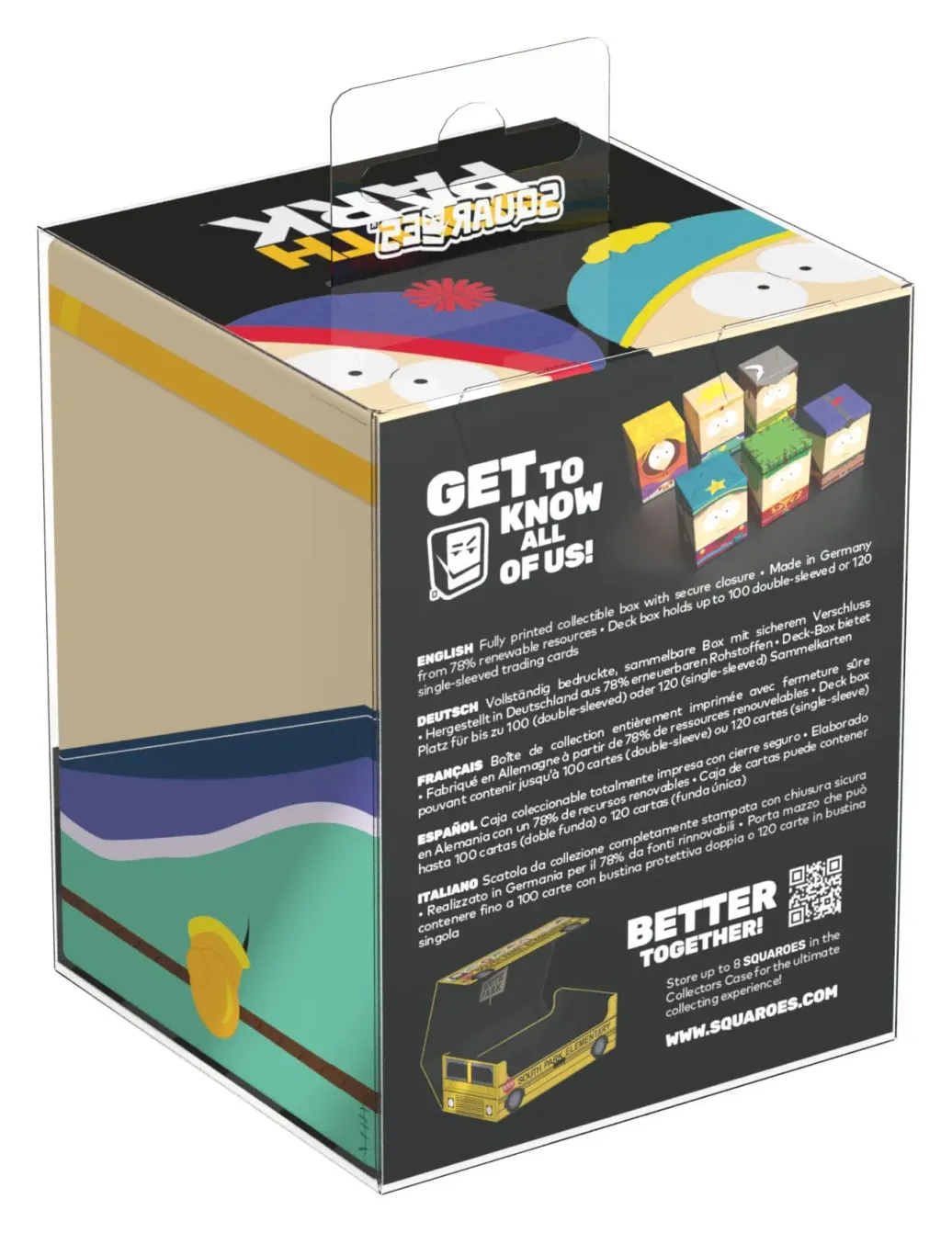 Sammelbare Box zur Aufbewahrung von TCG-Decks, Tabletop-Zubehör und/oder Sammlerstücken. Jeder Squaroe aus der South Park™-Edition bietet als Deck-Box benutzt Platz für bis zu 100 Spielkarten in doppelter Schutzhülle. Squaroes werden aus 78% erneuerbaren Rohstoffen hergestellt und passen perfekt in das separat erhältliche Collectors Case.