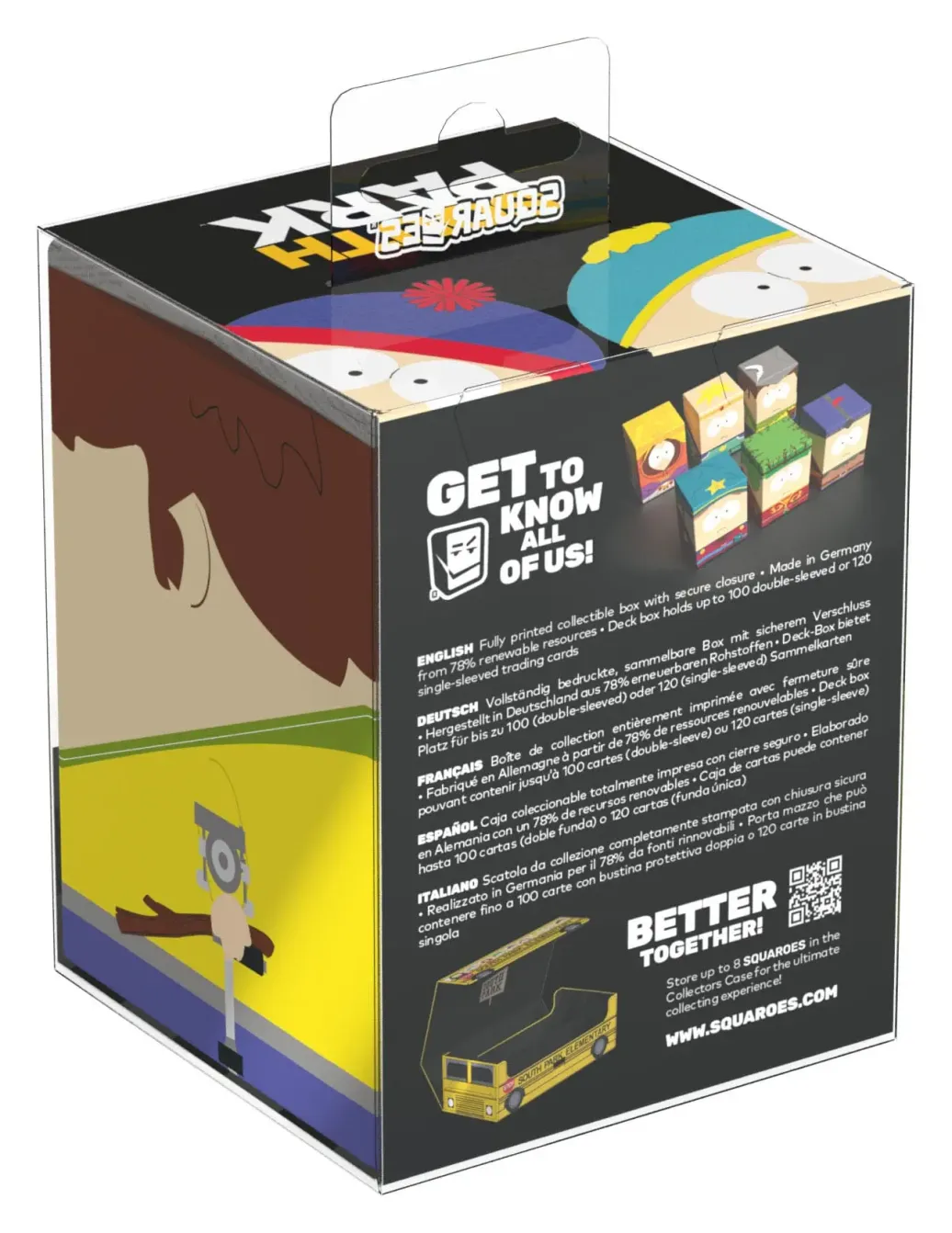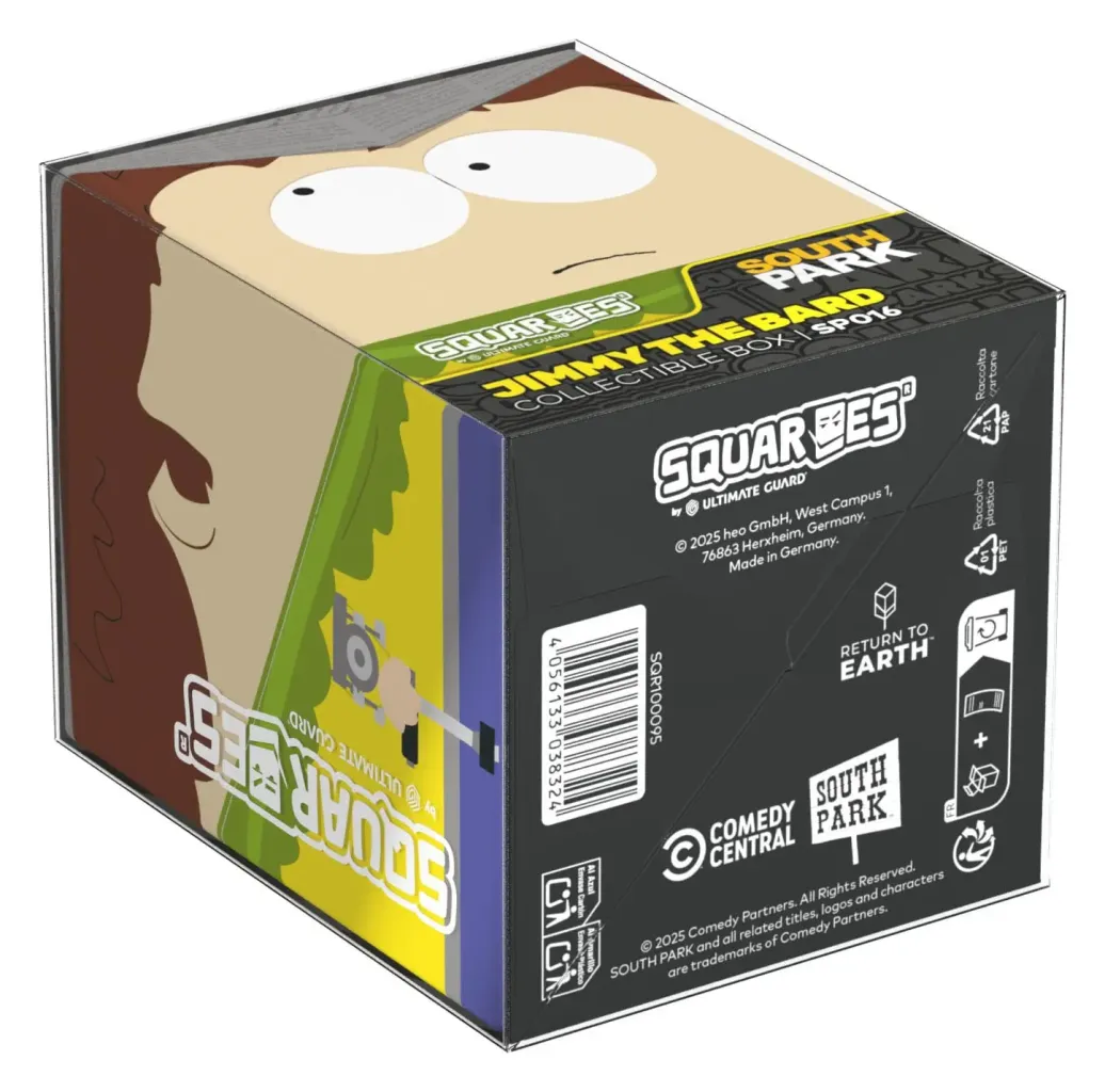 Sammelbare Box zur Aufbewahrung von TCG-Decks, Tabletop-Zubehör und/oder Sammlerstücken. Jeder Squaroe aus der South Park™-Edition bietet als Deck-Box benutzt Platz für bis zu 100 Spielkarten in doppelter Schutzhülle. Squaroes werden aus 78% erneuerbaren Rohstoffen hergestellt und passen perfekt in das separat erhältliche Collectors Case.
