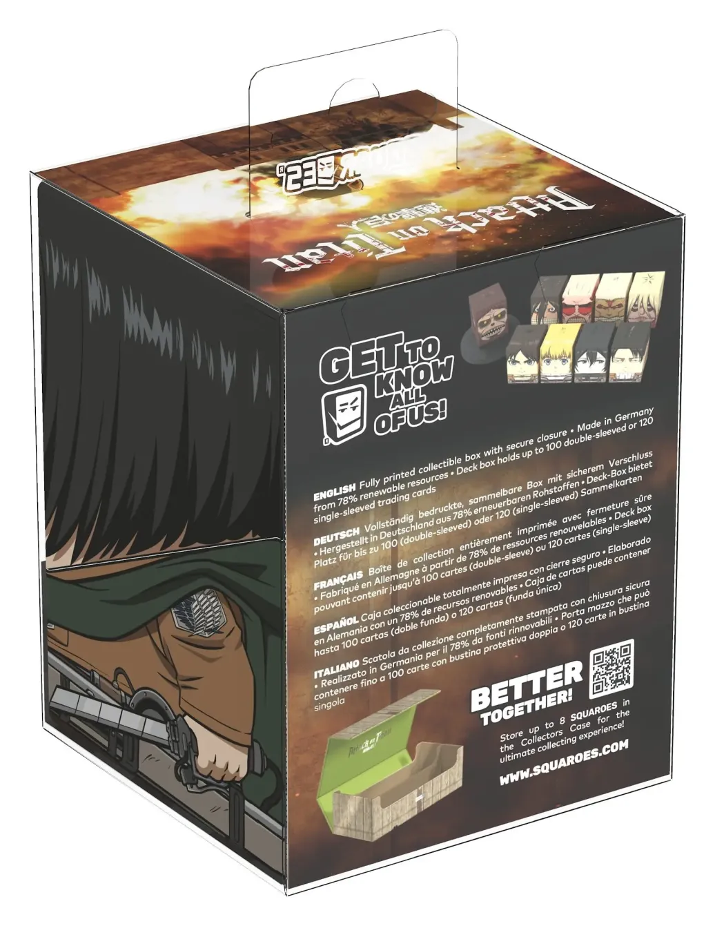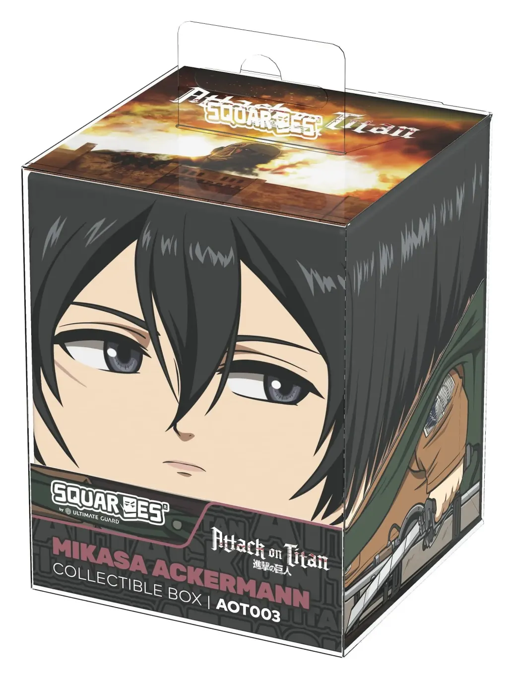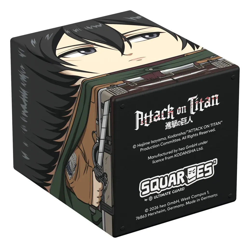 Sammelbare Box zur Aufbewahrung von TCG-Decks, Tabletop-Zubehör und/oder Sammlerstücken. Der Mikasa Ackermann Squaroe aus der Attack on Titan-Edition bietet als Deck-Box benutzt Platz für bis zu 100 Spielkarten in doppelter Schutzhülle. Squaroes werden aus 78% erneuerbaren Rohstoffen hergestellt und passen perfekt in das separat erhältliche Collectors Case.