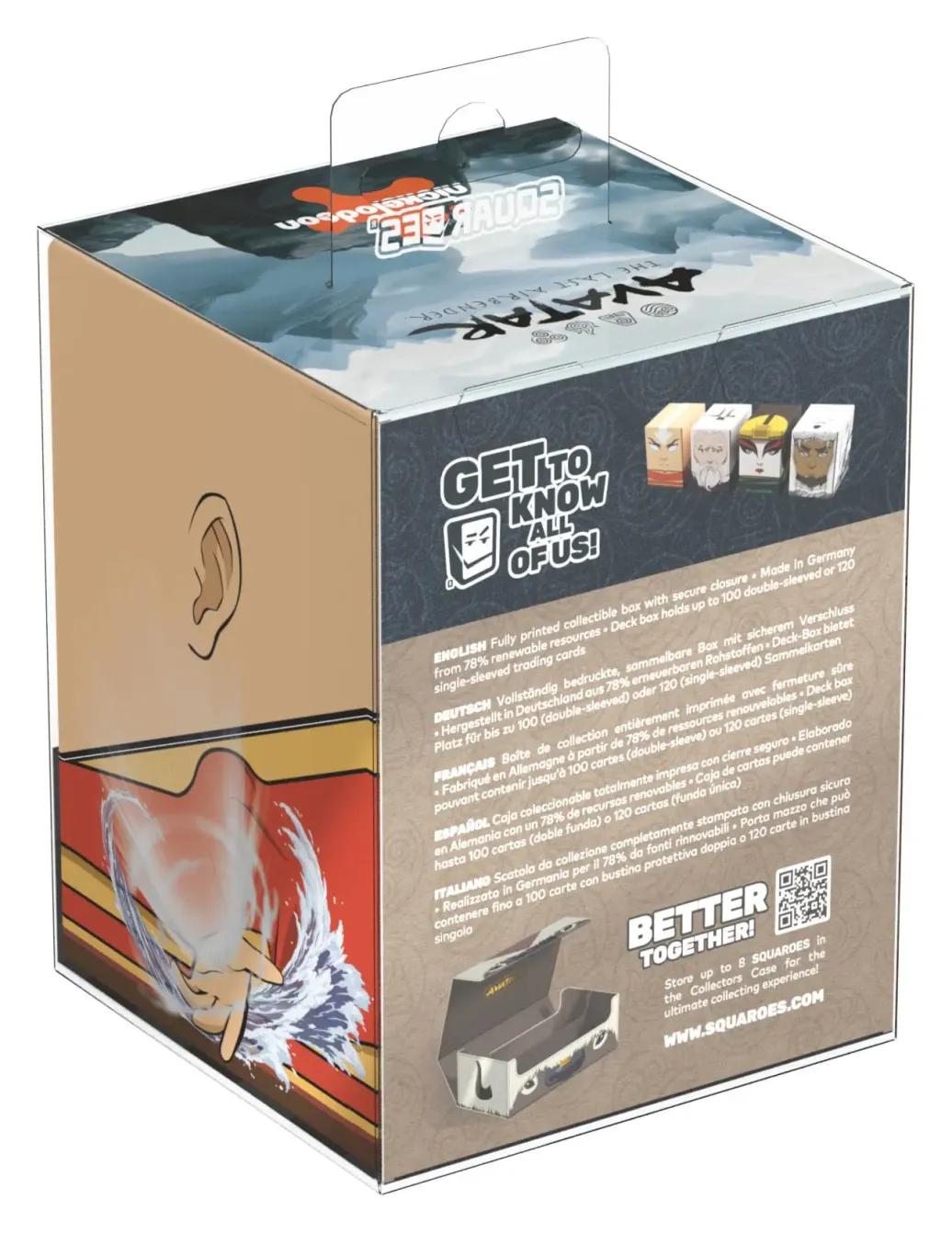 Sammelbare Box zur Aufbewahrung von TCG-Decks, Tabletop-Zubehör und/oder Sammlerstücken. Der Avatar Aang Squaroe aus der Avatar: The Last Airbender-Edition bietet als Deck-Box benutzt Platz für bis zu 100 Spielkarten in doppelter Schutzhülle. Squaroes werden aus 78% erneuerbaren Rohstoffen hergestellt und passen perfekt in das separat erhältliche Collectors Case.