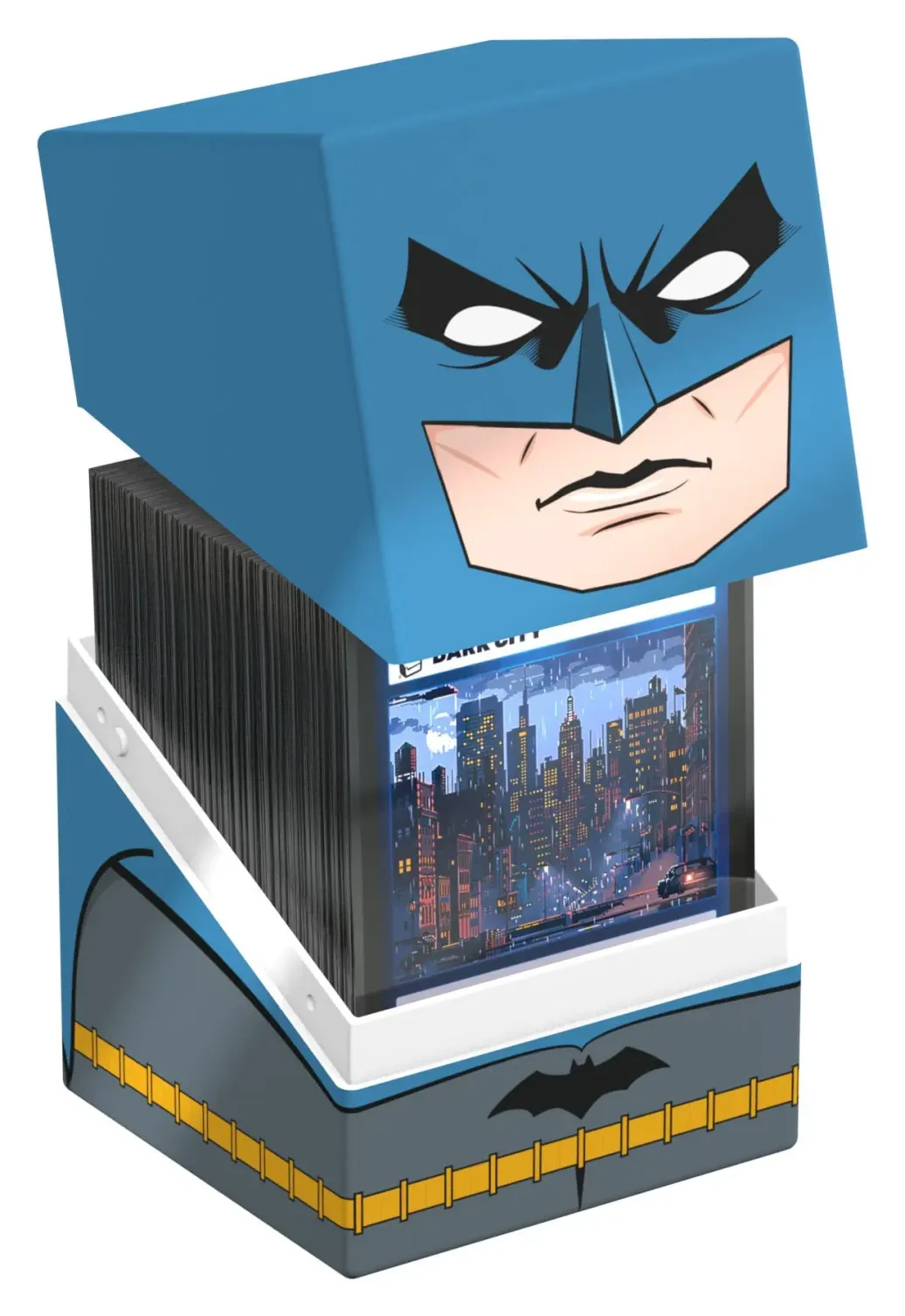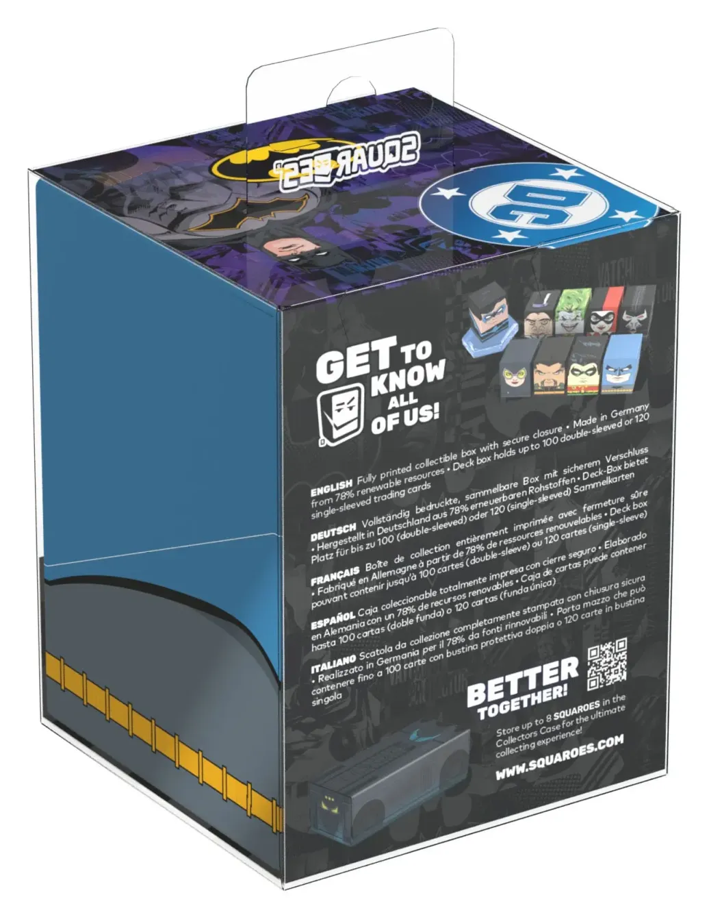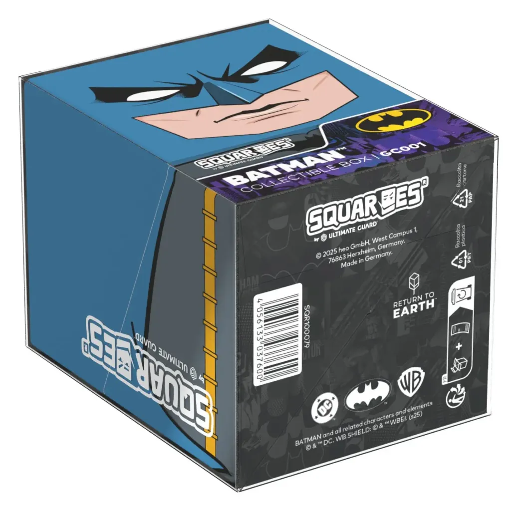 Sammelbare Box zur Aufbewahrung von TCG-Decks, Tabletop-Zubehör und/oder Sammlerstücken. Der Batman Squaroe aus der Batman: Gotham City-Edition bietet als Deck-Box benutzt Platz für bis zu 100 Spielkarten in doppelter Schutzhülle. Squaroes werden aus 78% erneuerbaren Rohstoffen hergestellt und passen perfekt in das separat erhältliche Collectors Case.