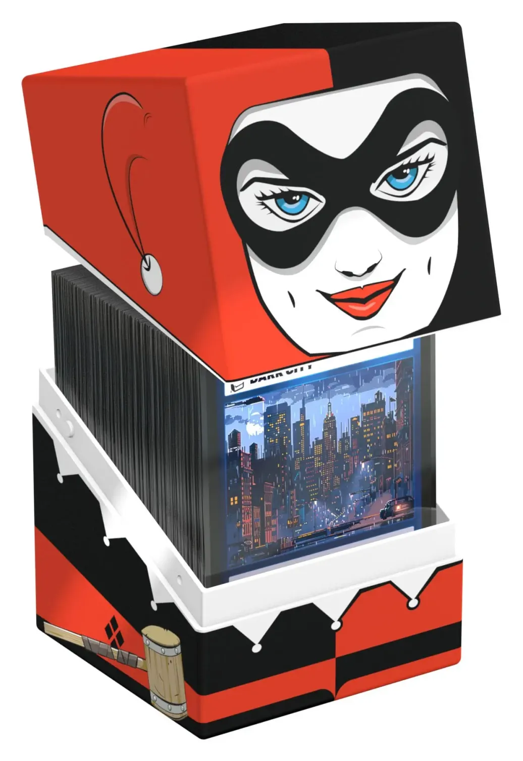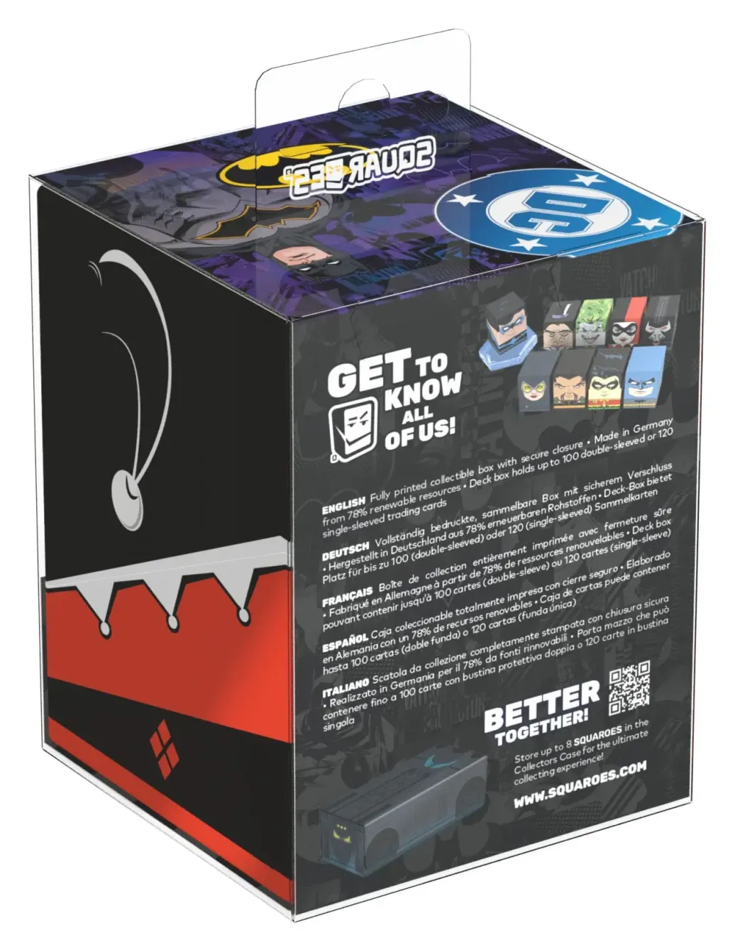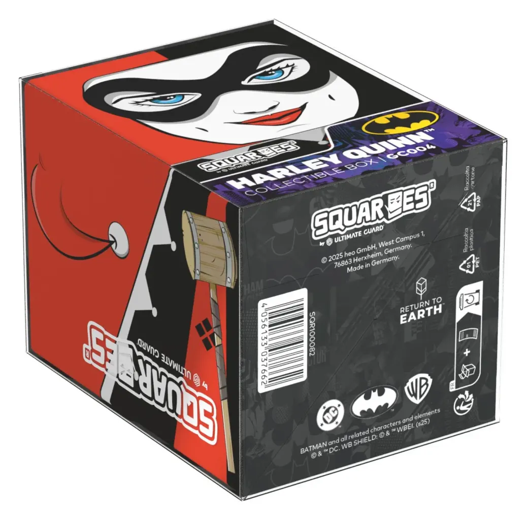 Sammelbare Box zur Aufbewahrung von TCG-Decks, Tabletop-Zubehör und/oder Sammlerstücken. Der Harley Quinn Squaroe aus der Batman: Gotham City-Edition bietet als Deck-Box benutzt Platz für bis zu 100 Spielkarten in doppelter Schutzhülle. Squaroes werden aus 78% erneuerbaren Rohstoffen hergestellt und passen perfekt in das separat erhältliche Collectors Case.