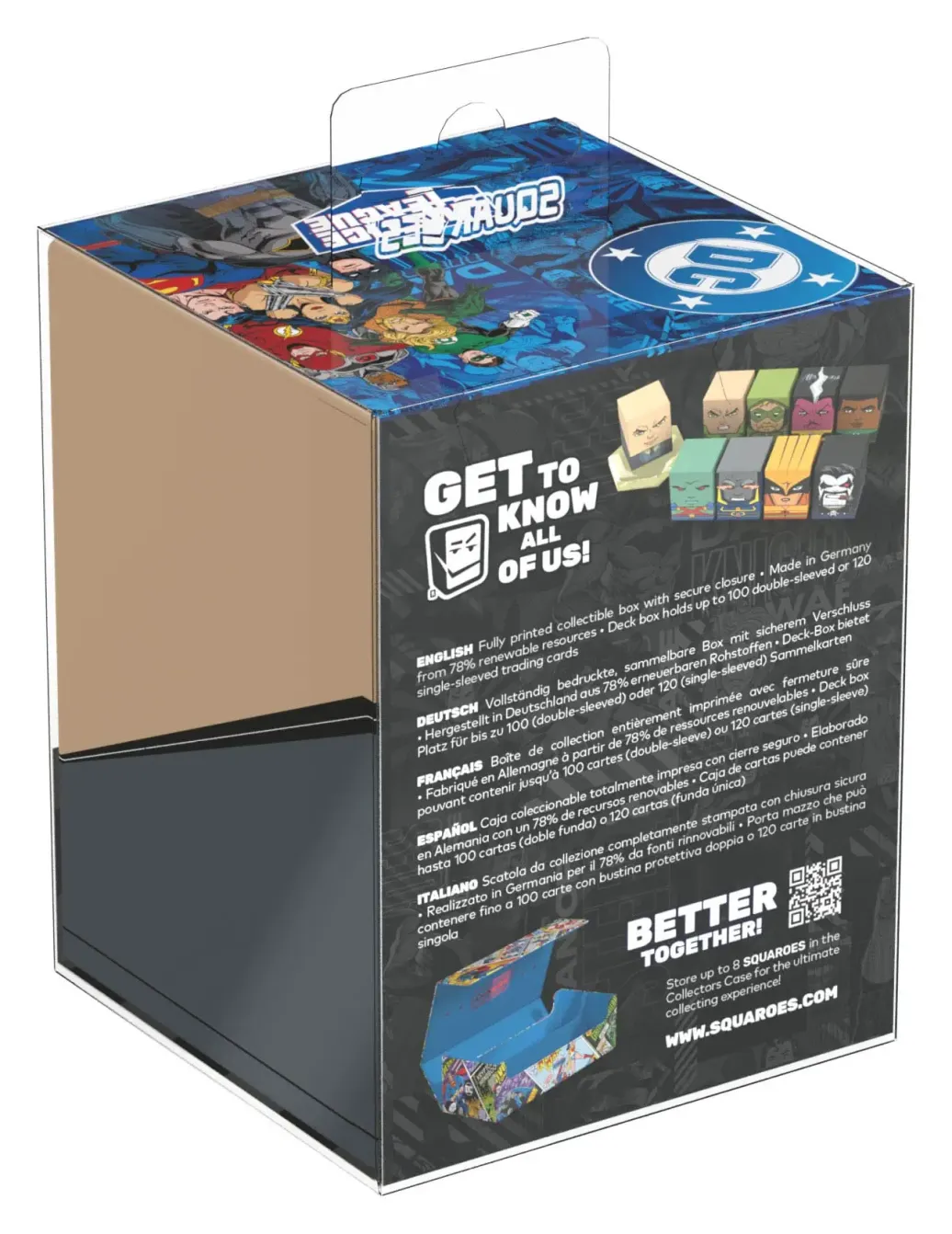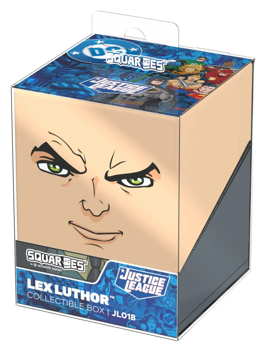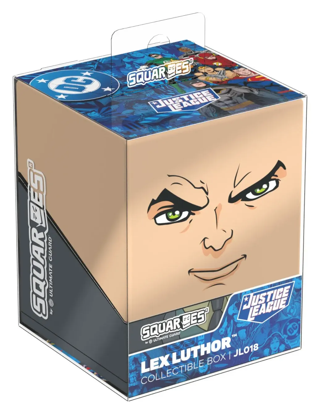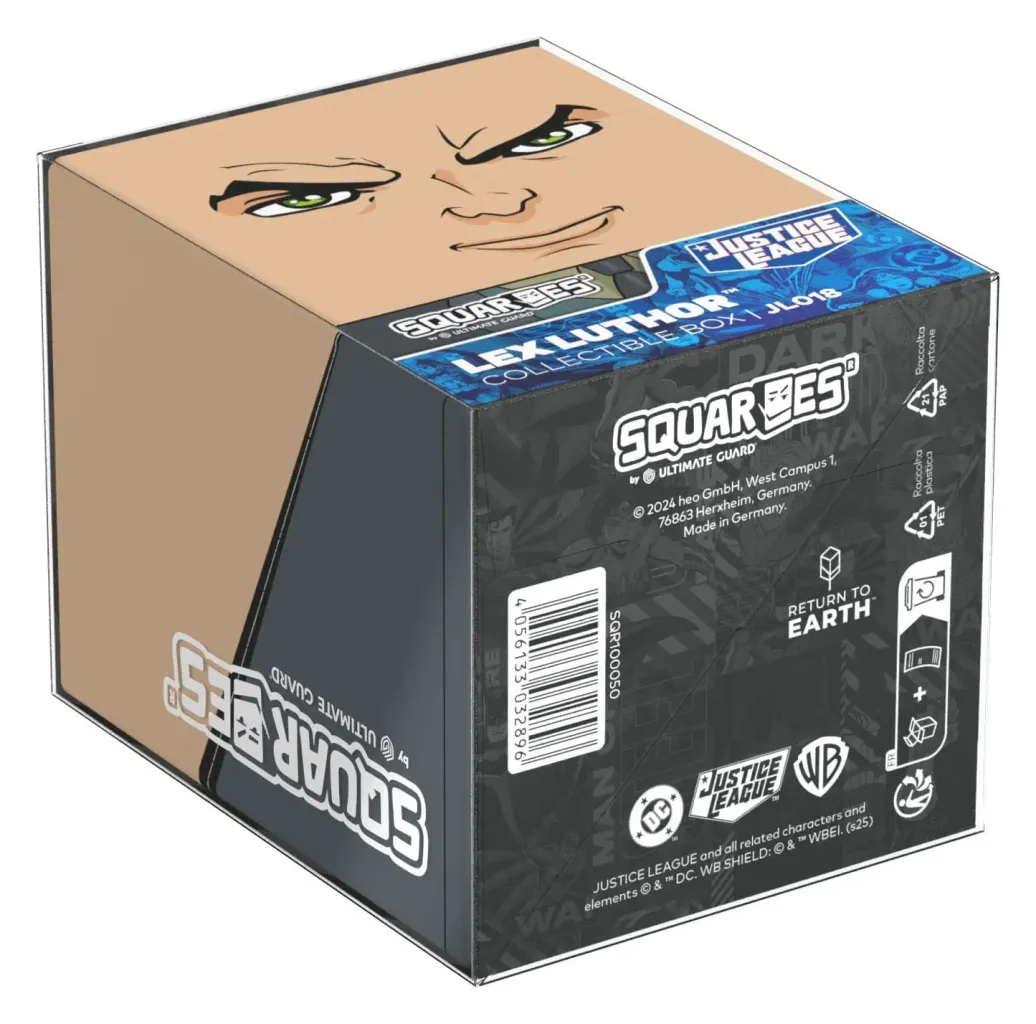 Sammelbare Box zur Aufbewahrung von TCG-Decks, Tabletop-Zubehör und/oder Sammlerstücken. Der Lex Luthor™ Squaroe aus der DC Justice League™-Edition bietet als Deck-Box benutzt Platz für bis zu 100 Spielkarten in doppelter Schutzhülle. Squaroes werden aus 78% erneuerbaren Rohstoffen hergestellt.