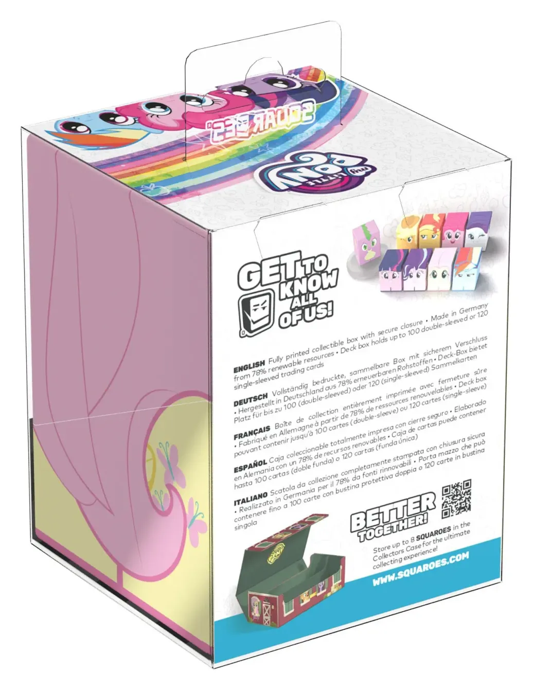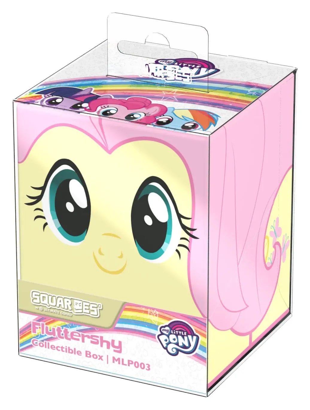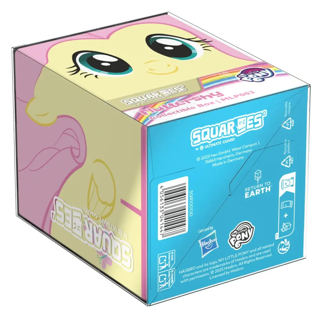 Sammelbare Box zur Aufbewahrung von TCG-Decks, Tabletop-Zubehör und/oder Sammlerstücken. Der Fluttershy Squaroe aus der My Little Pony "Friendship is Magic"-Edition bietet als Deck-Box benutzt Platz für bis zu 100 Spielkarten in doppelter Schutzhülle. Squaroes werden aus 78% erneuerbaren Rohstoffen hergestellt.