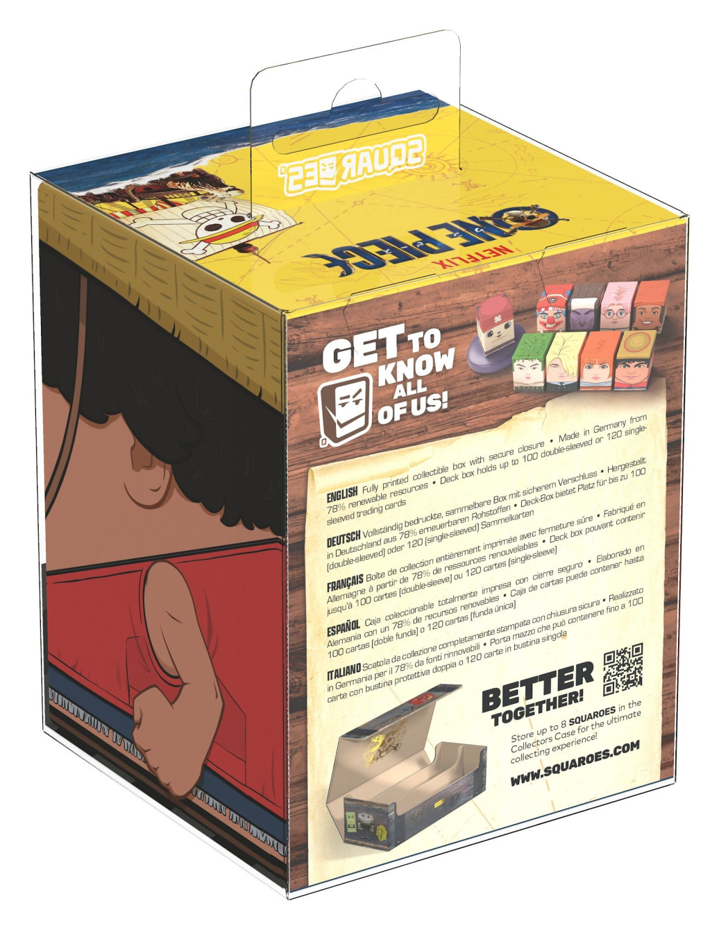 Vergesst nicht, eure ONE PIECE-Sammlung mit dem passenden "Wooden Chest" Collectors Case zu vervollständigen - der perfekten Box zur Aufbewahrung von bis zu acht Squaroes!