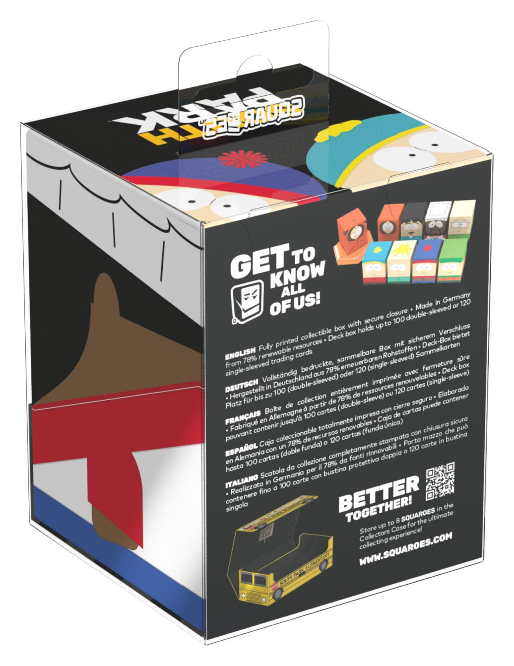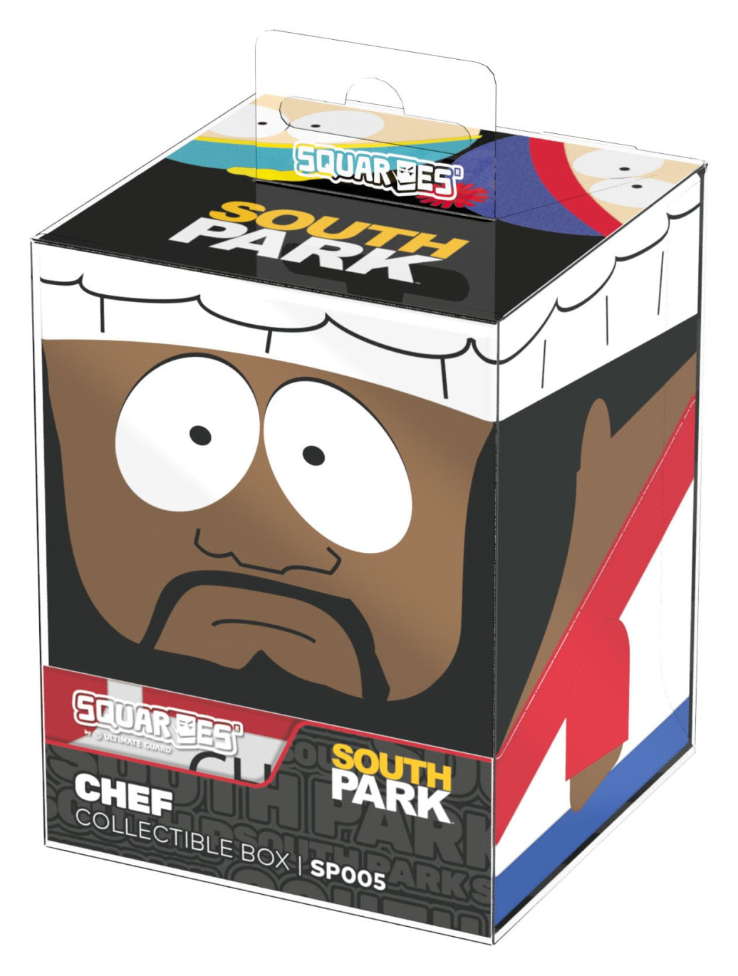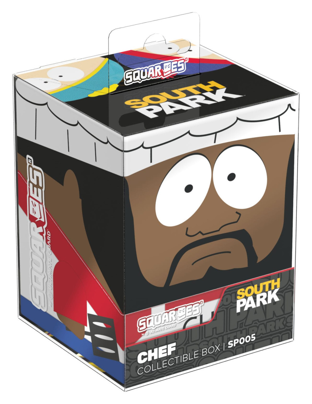 Sammelbare Box zur Aufbewahrung von TCG-Decks, Tabletop-Zubehör und/oder Sammlerstücken. Der Chef Squaroe aus der South Park™-Edition bietet als Deck-Box benutzt Platz für bis zu 100 Spielkarten in doppelter Schutzhülle. Squaroes werden aus 78% erneuerbaren Rohstoffen hergestellt und passen perfekt in das separat erhältliche Collectors Case.