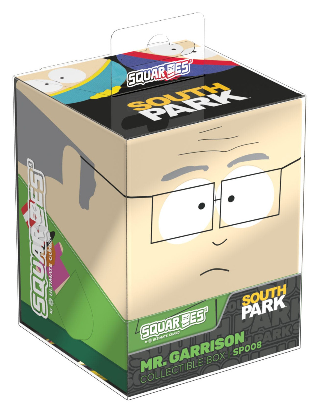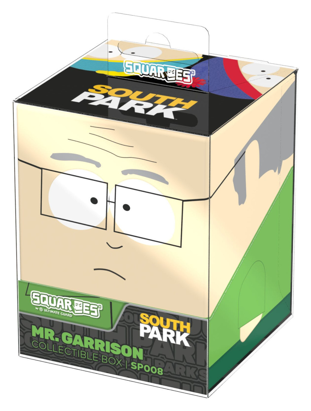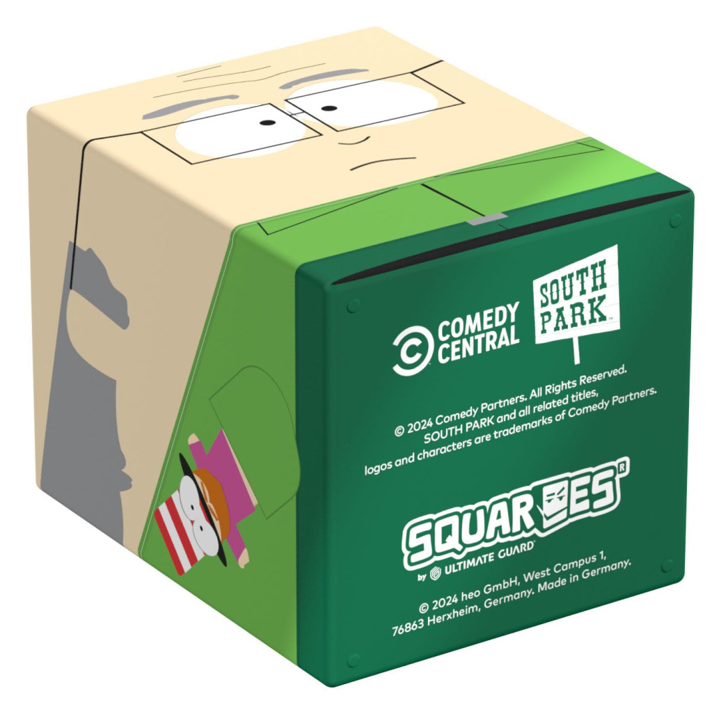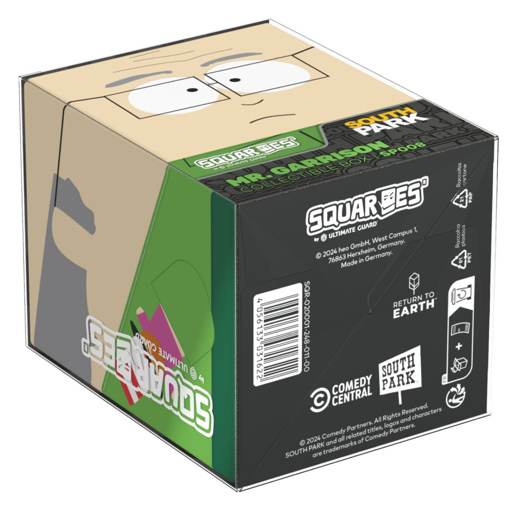 Sammelbare Box zur Aufbewahrung von TCG-Decks, Tabletop-Zubehör und/oder Sammlerstücken. Der Mr. Garrison Squaroe aus der South Park™-Edition bietet als Deck-Box benutzt Platz für bis zu 100 Spielkarten in doppelter Schutzhülle. Squaroes werden aus 78% erneuerbaren Rohstoffen hergestellt und passen perfekt in das separat erhältliche Collectors Case.
