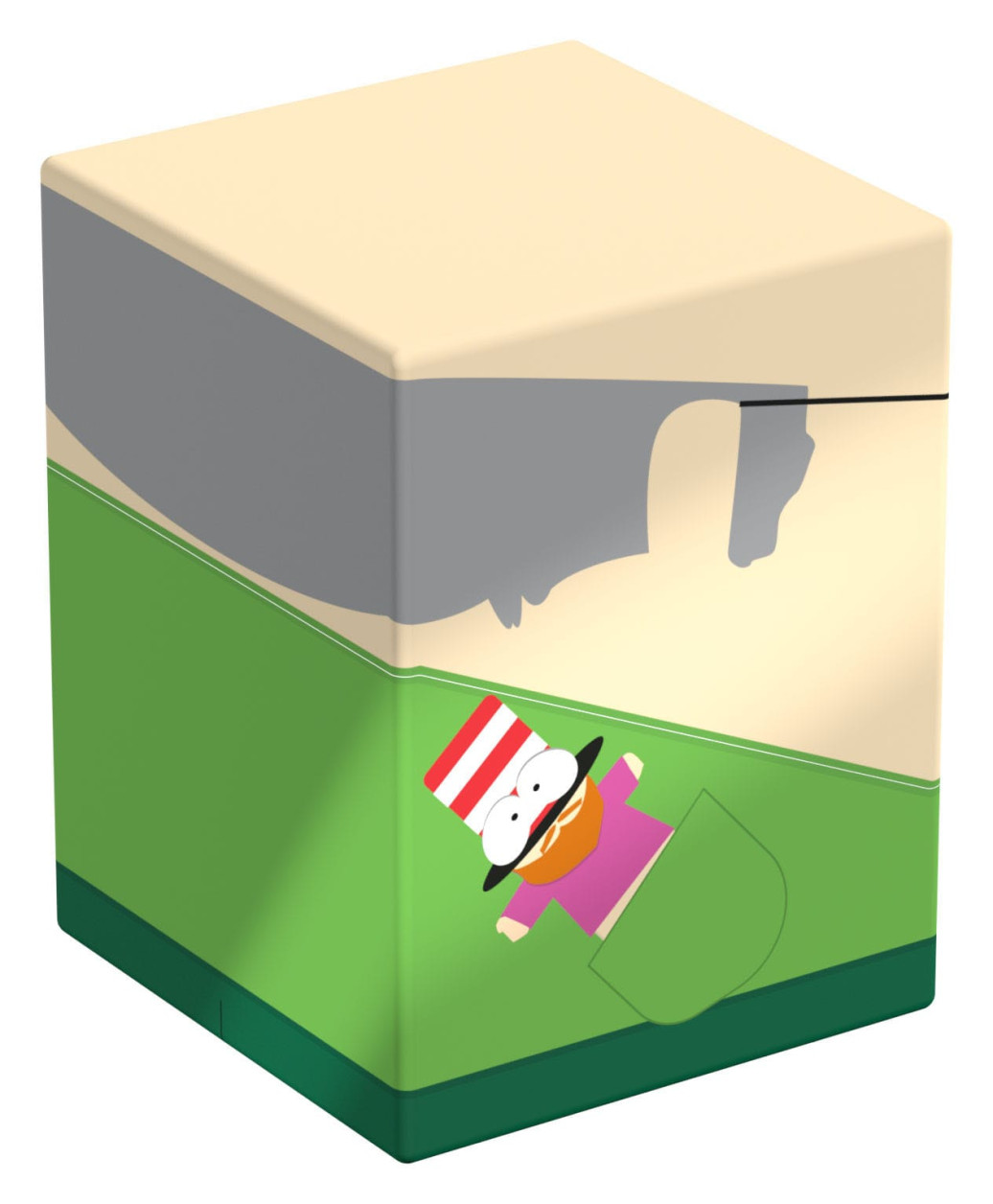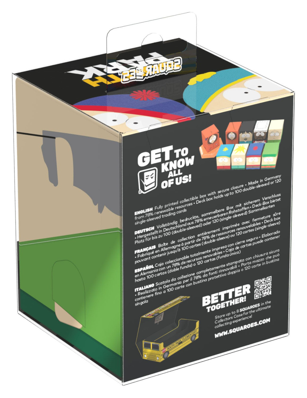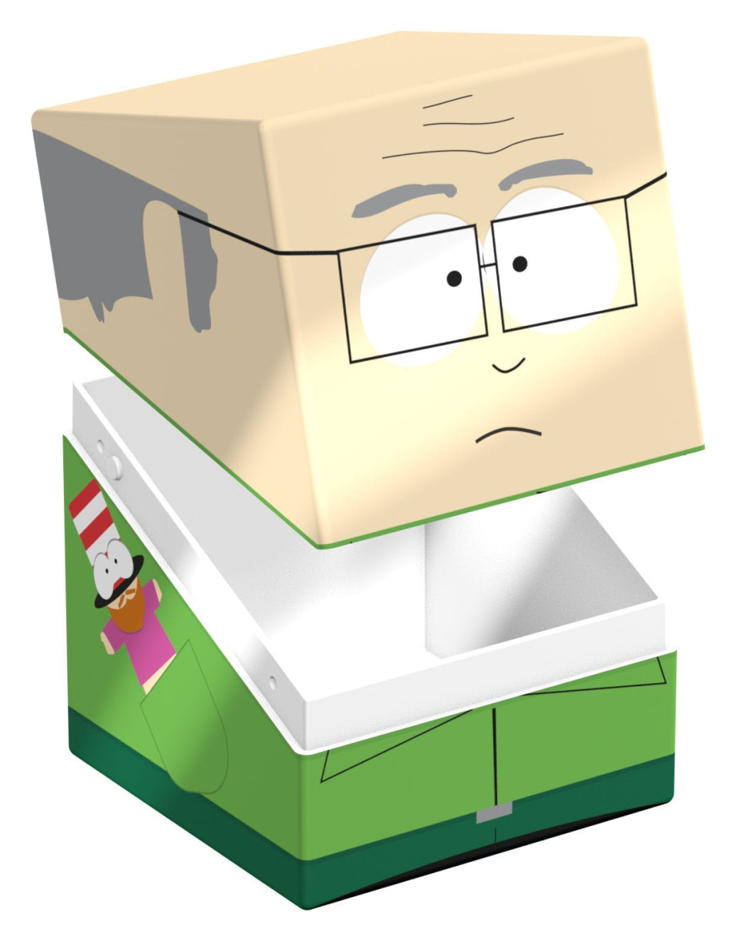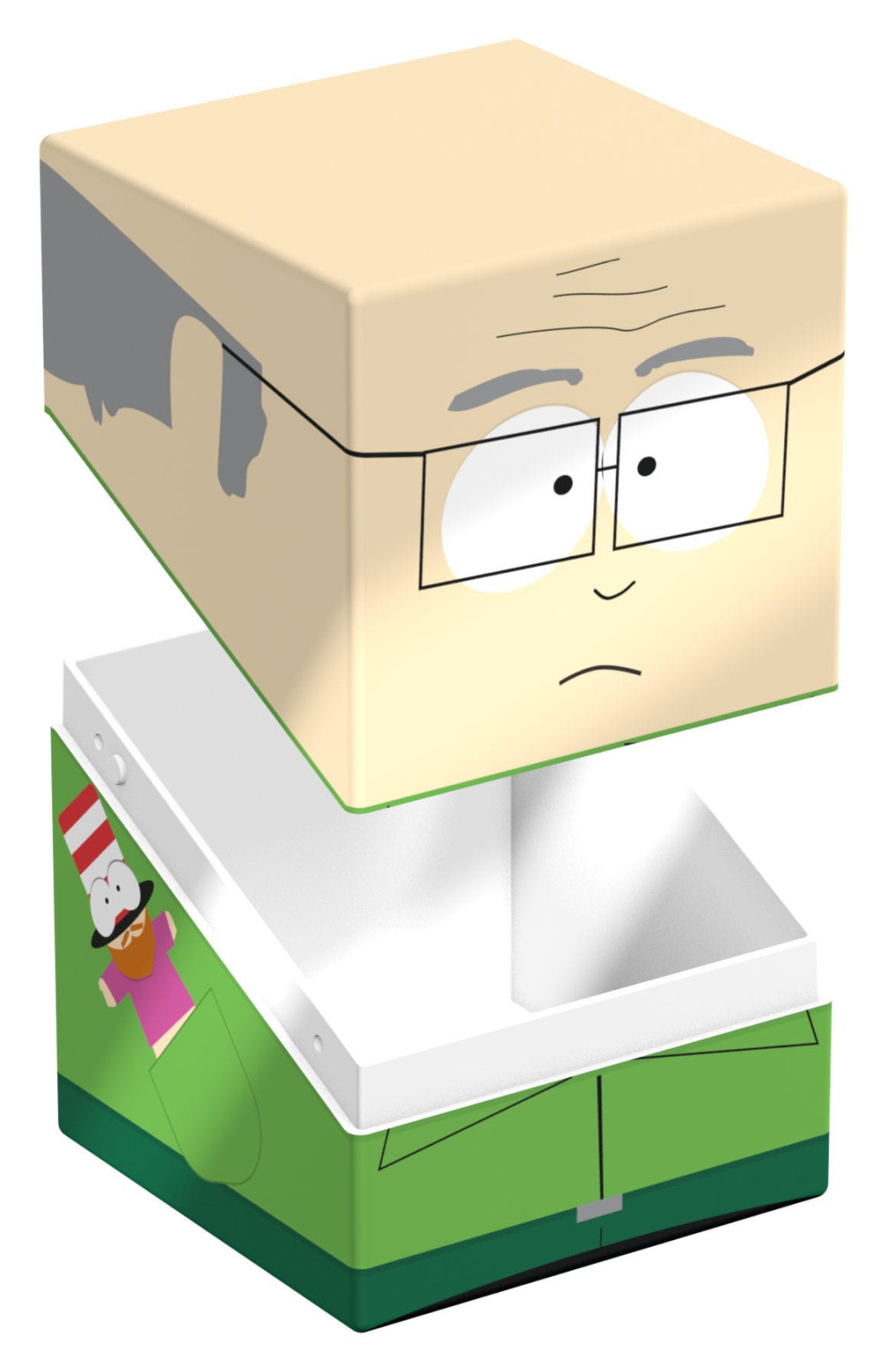 Sammelbare Box zur Aufbewahrung von TCG-Decks, Tabletop-Zubehör und/oder Sammlerstücken. Der Mr. Garrison Squaroe aus der South Park™-Edition bietet als Deck-Box benutzt Platz für bis zu 100 Spielkarten in doppelter Schutzhülle. Squaroes werden aus 78% erneuerbaren Rohstoffen hergestellt und passen perfekt in das separat erhältliche Collectors Case.