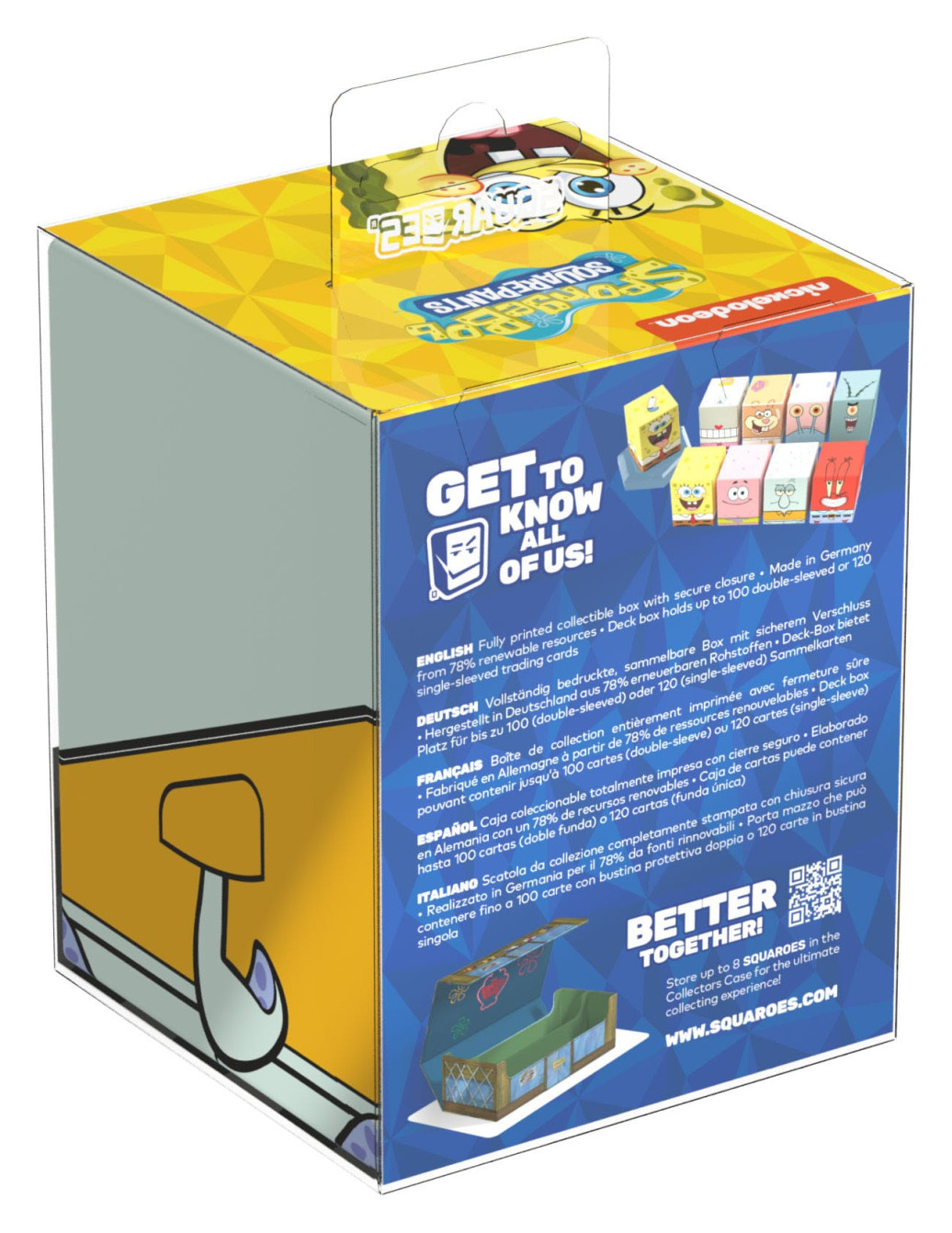 Sammelbare Box zur Aufbewahrung von TCG-Decks, Tabletop-Zubehör und/oder Sammlerstücken. Der Squidward Squaroe aus der SpongeBob SquarePants™-Edition bietet als Deck-Box benutzt Platz für bis zu 100 Spielkarten in doppelter Schutzhülle. Squaroes werden aus 78% erneuerbaren Rohstoffen hergestellt und passen perfekt in das separat erhältliche Collectors Case.
