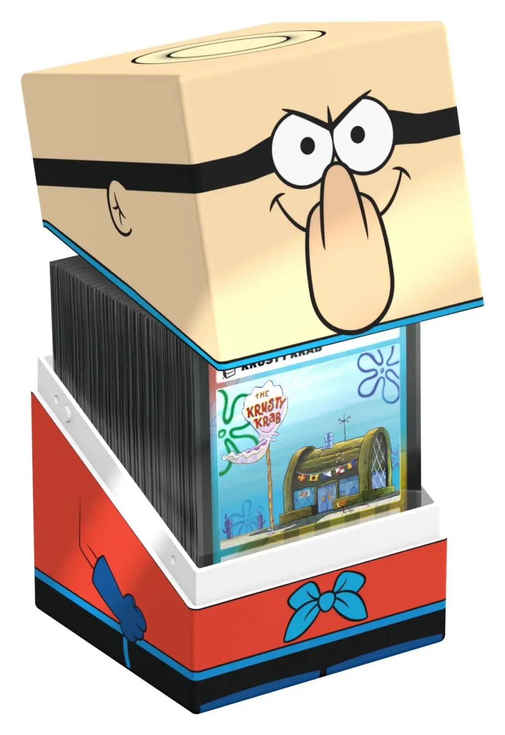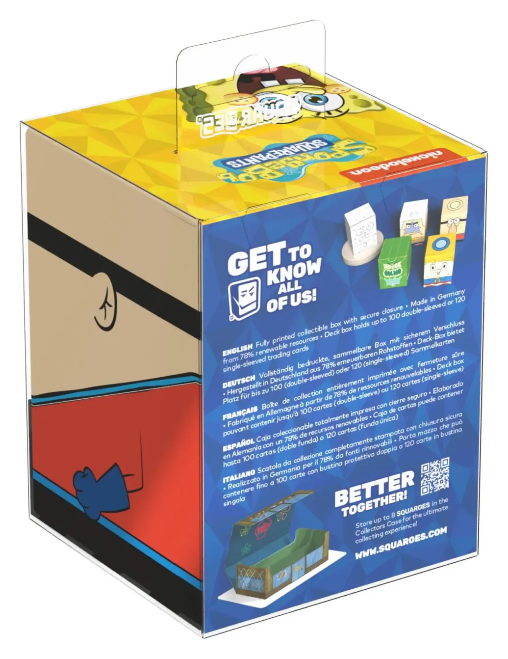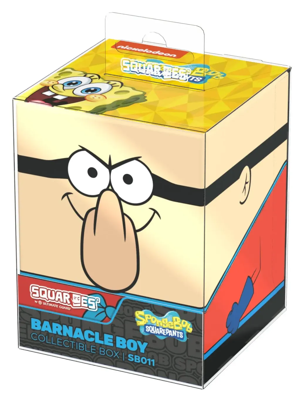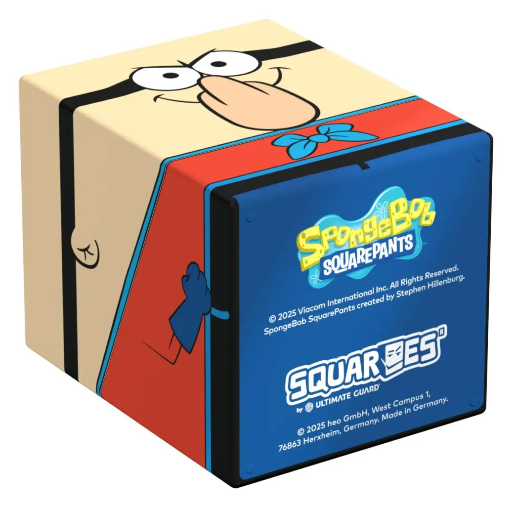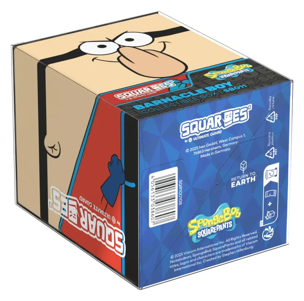 Sammelbare Box zur Aufbewahrung von TCG-Decks, Tabletop-Zubehör und/oder Sammlerstücken. Der Barnacle Boy Squaroe aus der SpongeBob SquarePants™-Edition bietet als Deck-Box benutzt Platz für bis zu 100 Spielkarten in doppelter Schutzhülle. Squaroes werden aus 78% erneuerbaren Rohstoffen hergestellt und passen perfekt in das separat erhältliche Collectors Case.