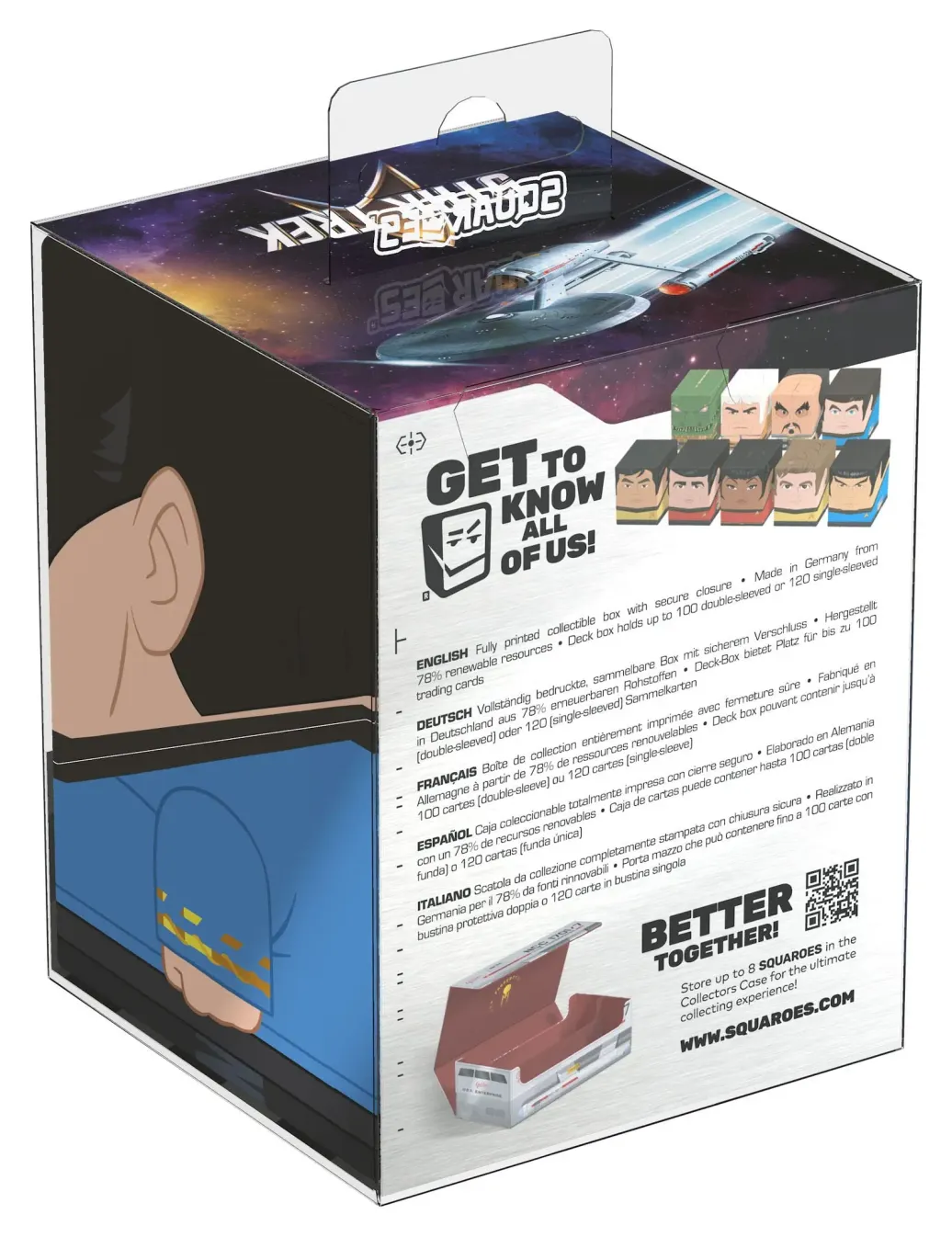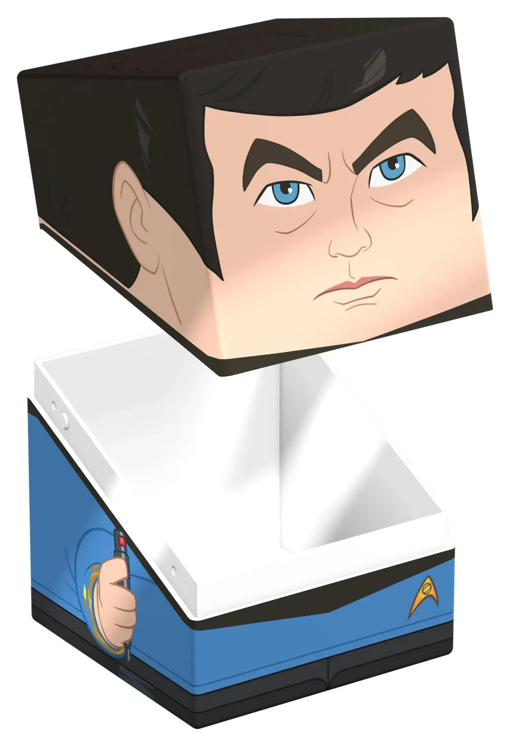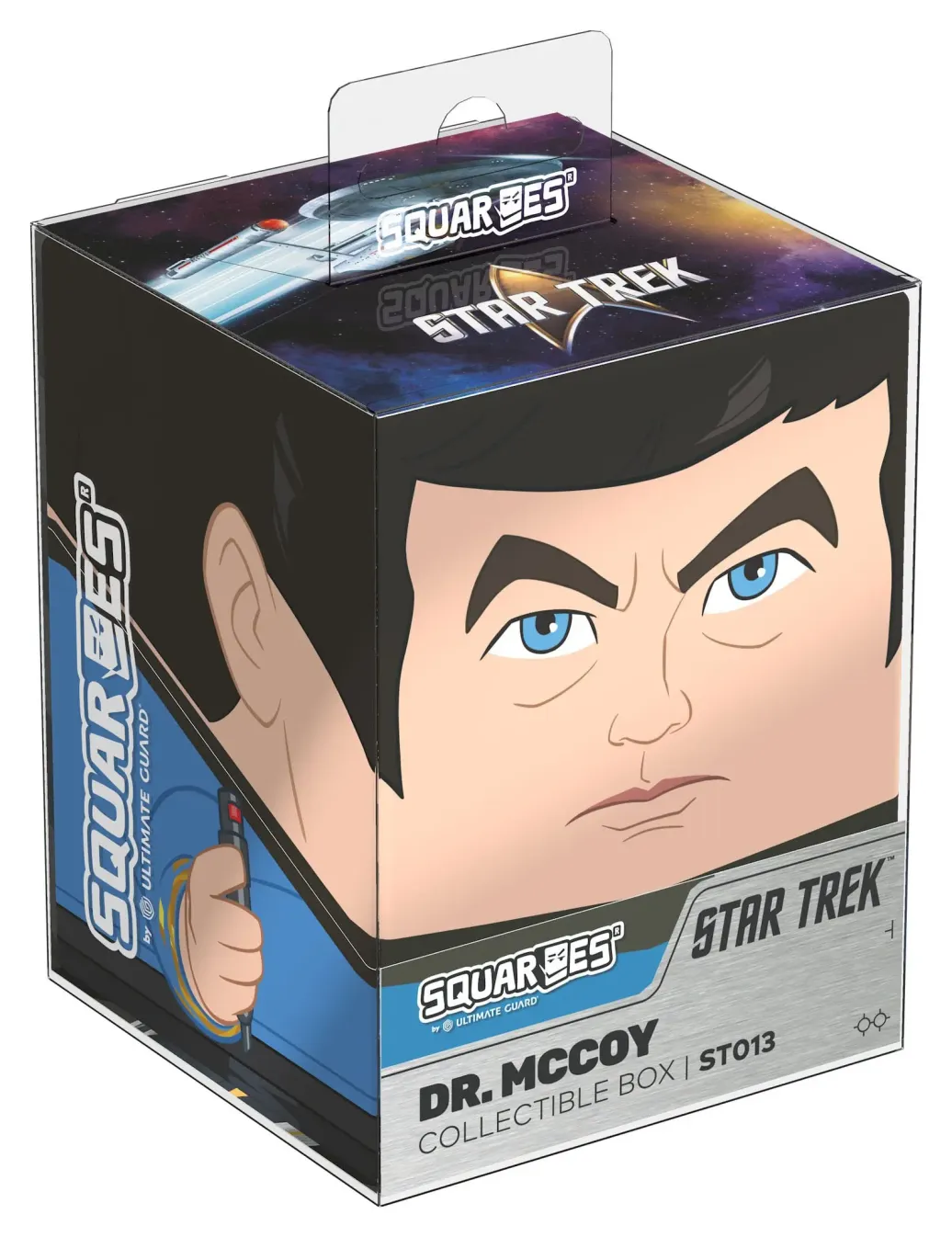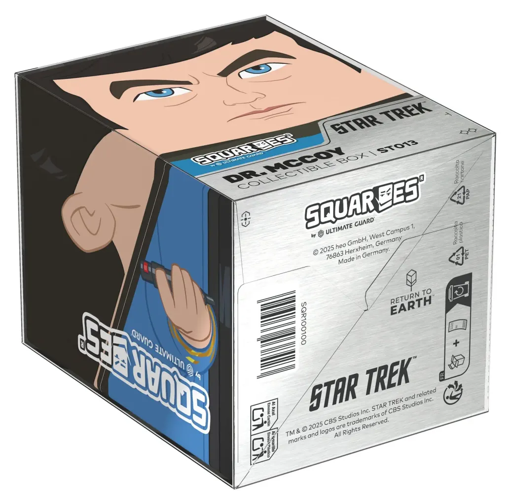 Sammelbare Box zur Aufbewahrung von TCG-Decks, Tabletop-Zubehör und/oder Sammlerstücken. Der Dr. McCoy Squaroe aus der Star Trek: The Original Series-Edition bietet als Deck-Box benutzt Platz für bis zu 100 Spielkarten in doppelter Schutzhülle. Squaroes werden aus 78% erneuerbaren Rohstoffen hergestellt und passen perfekt in das separat erhältliche Collectors Case.
