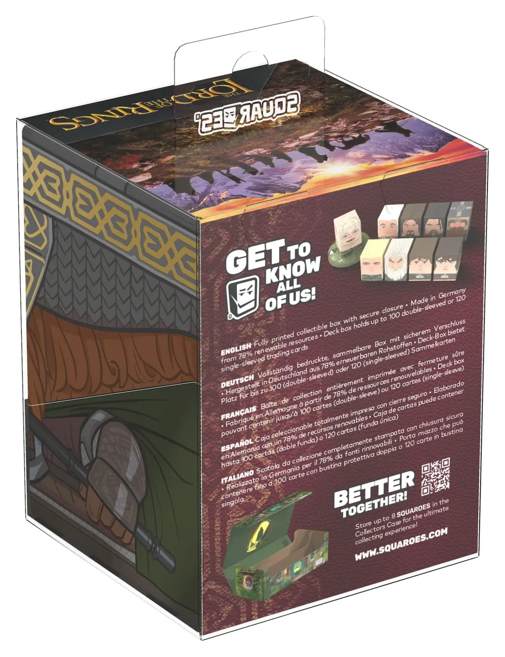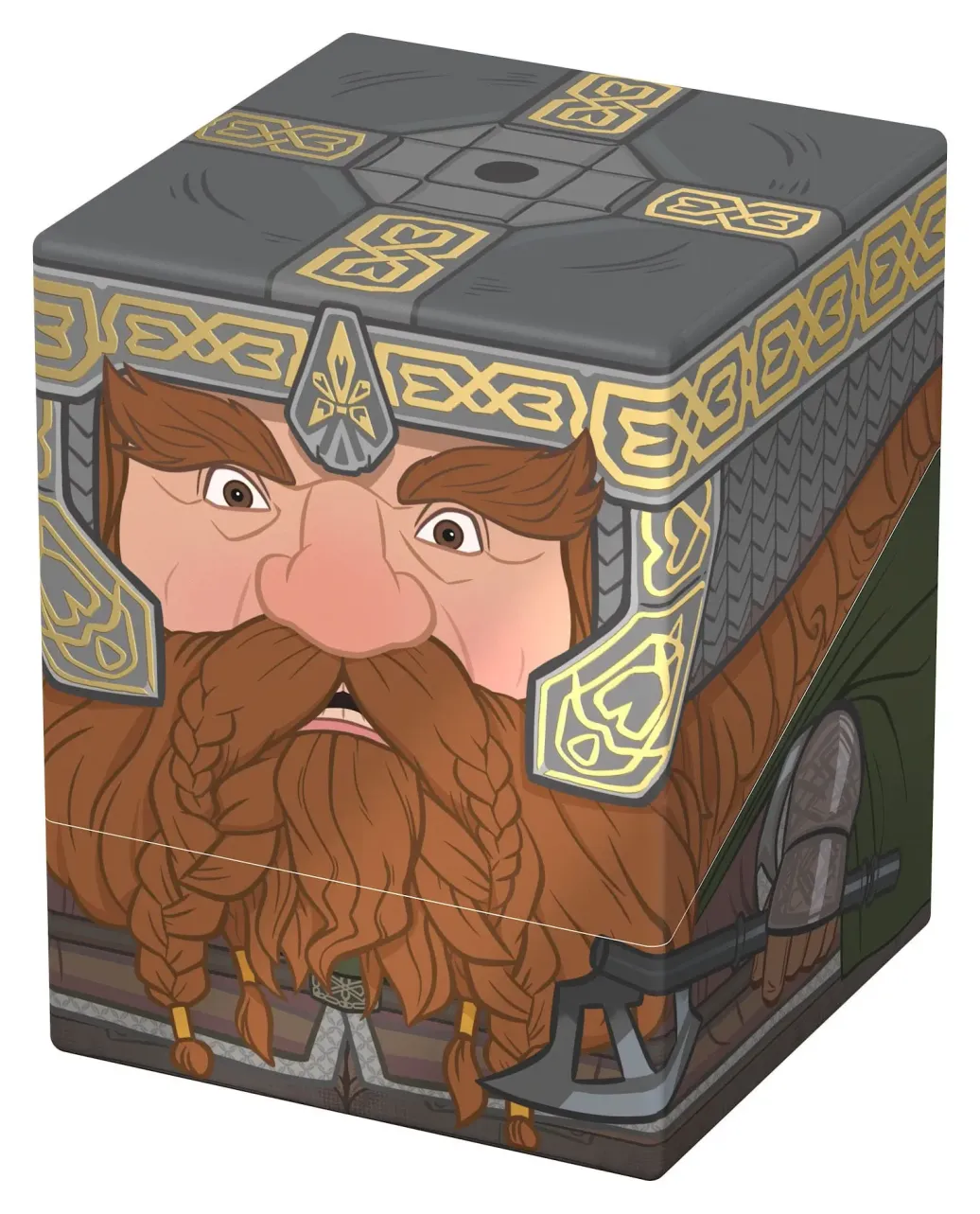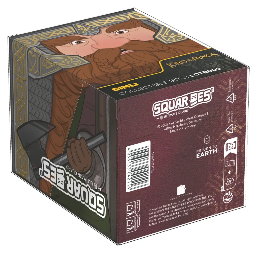 Sammelbare Box zur Aufbewahrung von TCG-Decks, Tabletop-Zubehör und/oder Sammlerstücken. Der Gimli Squaroe aus der The Lord of the Rings-Edition bietet als Deck-Box benutzt Platz für bis zu 100 Spielkarten in doppelter Schutzhülle. Squaroes werden aus 78% erneuerbaren Rohstoffen hergestellt und passen perfekt in das separat erhältliche Collectors Case.