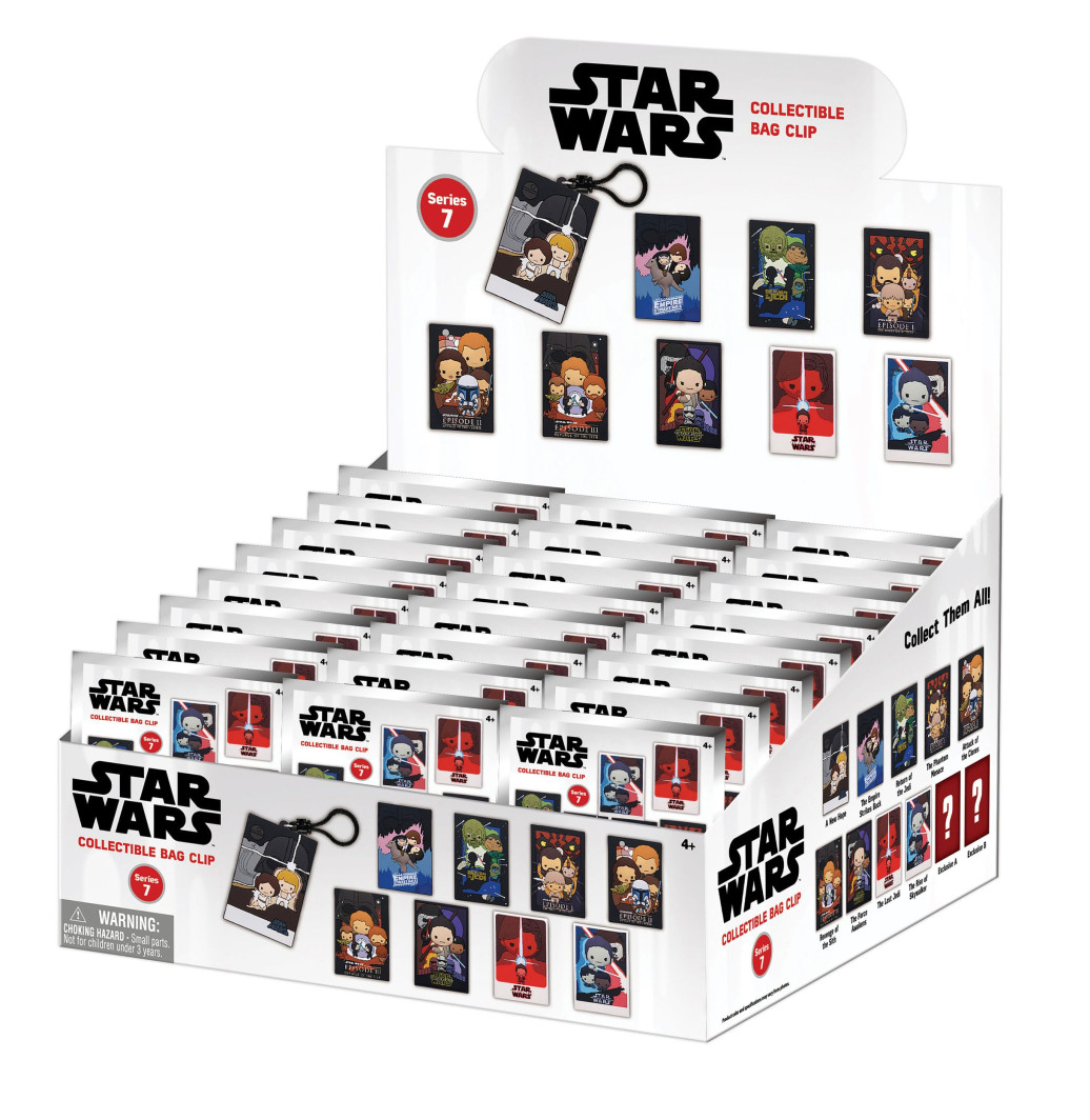 Display mit 24 Blind Bags mit je einem offiziell lizenzierten Taschenanhänger aus PVC.