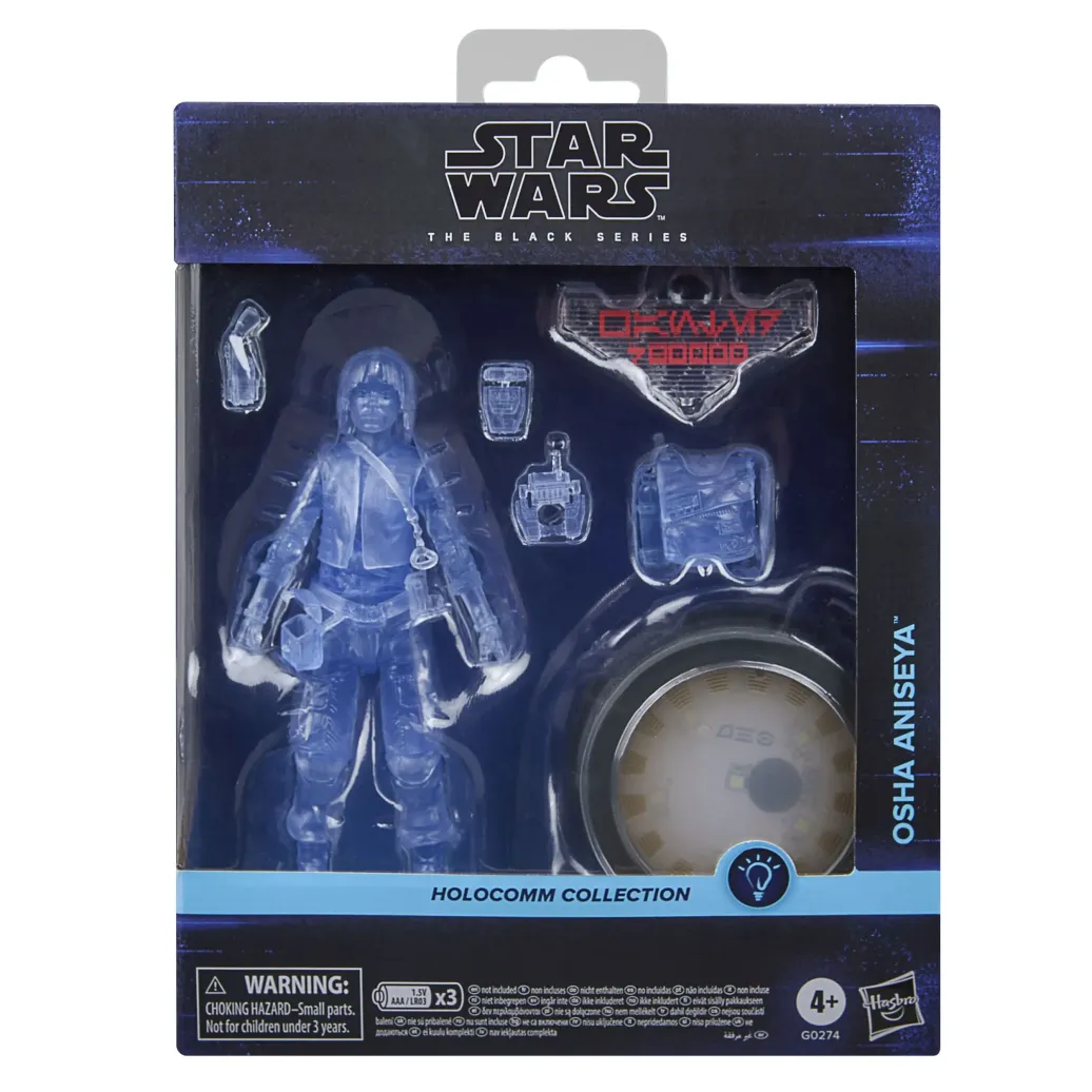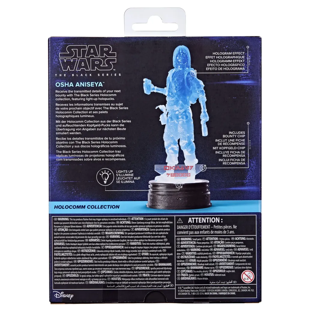Star Wars The Black Series umfasst Sammelfiguren (in einer Figuren-Skala von 15 cm), Fahrzeuge und Rollenspielartikel zur über 40-jährigen Geschichte der Star Wars Galaxis. Die Star Wars Action-Figur ist detailgetreu, sodass sie einer einzigartigen Hologramm-Version von Osha Aniseya gleicht und verfügt über ein Premium-Design und mehrere Bewegungspunkte. Außerdem kommen alle Figuren aus der The Black Series Holocomm Collection mit einem aufleuchtenden Kopfgeld-Puck zum Ausstellen! (Zusätzliche Produkte sind jeweils separat erhältlich. Je nach Verfügbarkeit.)