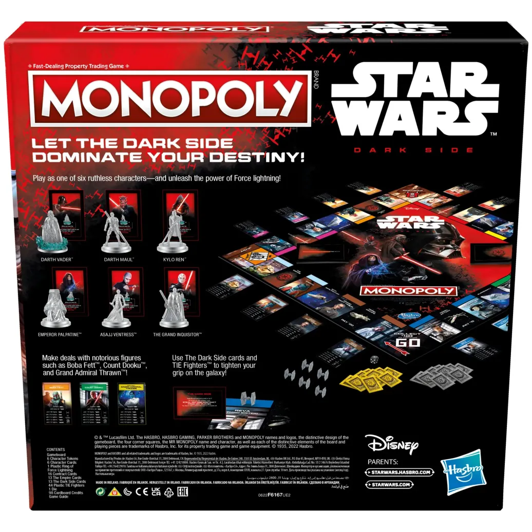 Hier erhält das klassische Monopoly einen Star Wars Touch, inspiriert von der Dunklen Seite in den Star Wars Filmen. Im Monopoly Star Wars Brettspiel "Die dunkle Seite der Macht" für Familien und Kinder rekrutieren die Spieler so viele berüchtigte Schurken wie möglich. Je mehr Verträge sie haben, desto mehr Kredits sammeln sie. Wer den Ring des Macht-Blitzes besitzt, kann die Spezialfähigkeit seines Charakters aktivieren, mit Dunkle Seite-Karten lassen sich Gegner z.B. ins Gefängnis schicken und wer auf einem Schiffsfeld landet, darf in den Hyperraum springen. Wer als letzter Spieler noch Kredits besitzt, gewinnt. Enthält 6 Spielfiguren aus Zink, welche die bekannten Star Wars Charaktere Darth Vader, Kylo Ren, Asaj Ventress, den Imperator, Darth Maul und den Großinquisitor darstellen. Auf der Suche nach einem Brettspiel für Familien oder einem Geschenk? Diese Monopoly Star Wars Edition ist eine galaktische Wahl für Familien-Spieleabende und als Geschenk für Kinder ab 8 Jahren geeignet.