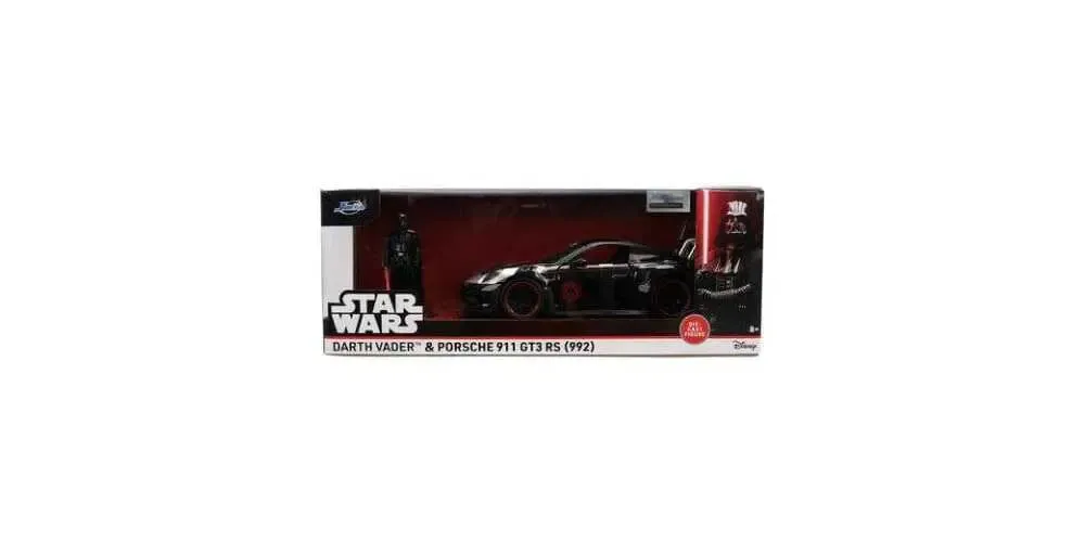 Druckguss-Modellauto des Porsche 911 GT3RS im Maßstab 1:24 mit Darth-Vader-Design. Das Modell verfügt über Freilauf, zu öffnende Türen und eine zu öffnende Motorhaube. Im Lieferumfang ist eine Darth-Vader-Figur aus Druckguss enthalten.