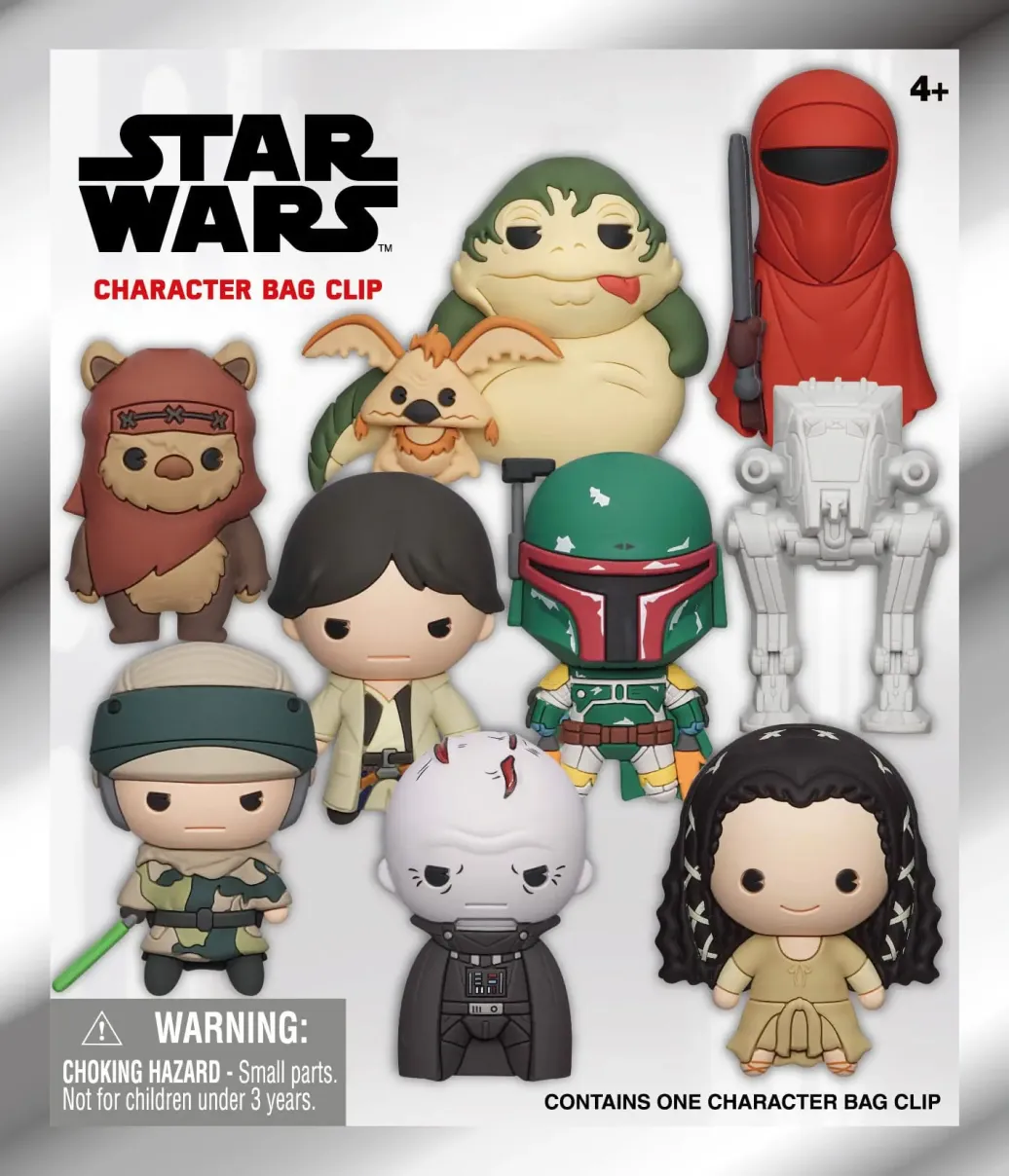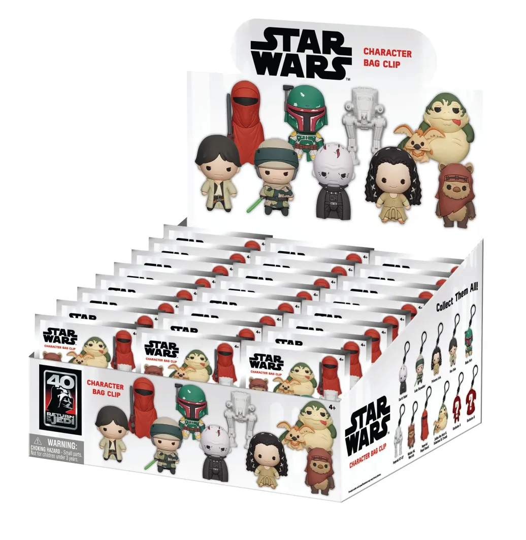 Display mit 24 Blind Bags mit je einem offiziell lizenzierten Taschenanhänger aus PVC.