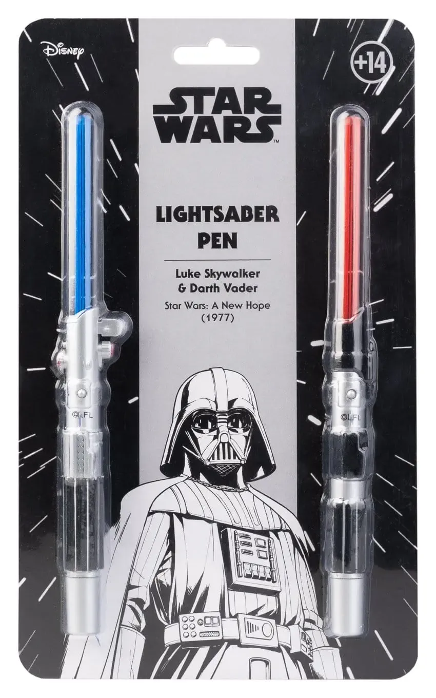 - Jeder Stift verfügt über einen LED-Beleuchtungsmodus: rot für Darth Vader und blau für Luke Skywalker