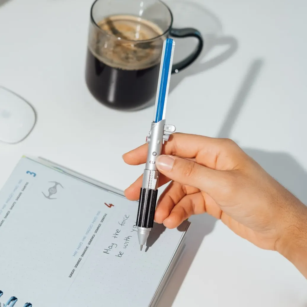 - Set aus zwei Stiften, die den ikonischsten Lichtschwertern der Franchise nachempfunden sind