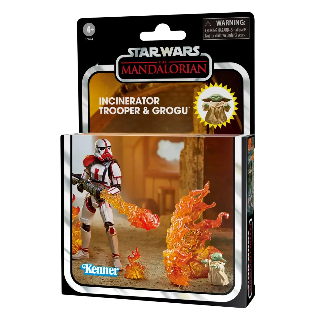 Der Incinerator Trooper verfügt über einen mächtigen Flammenwerfer, um seine Feinde und ihre Festungsanlagen in Brand zu setzen. Grogu ist eine kleine, mysteriöse Kreatur, die von Kopfgeldjägern verfolgt wird.